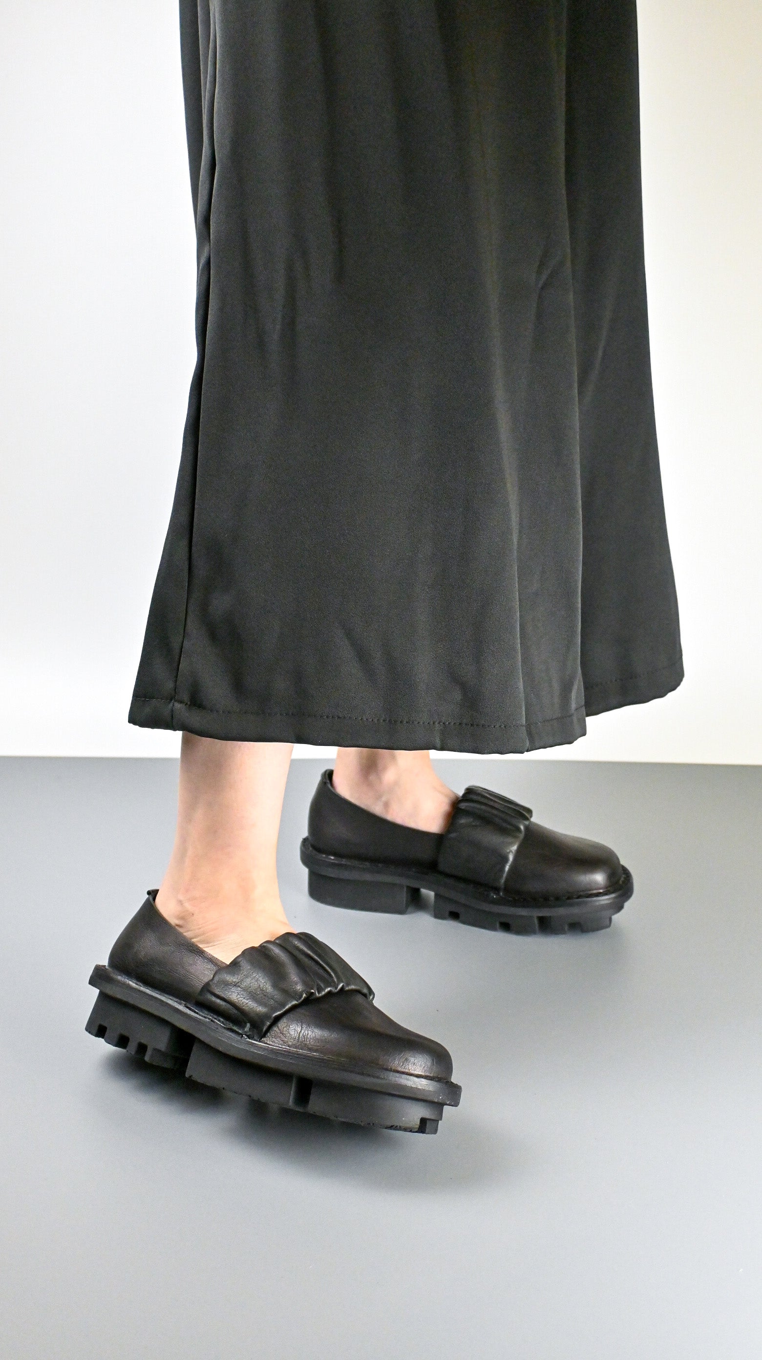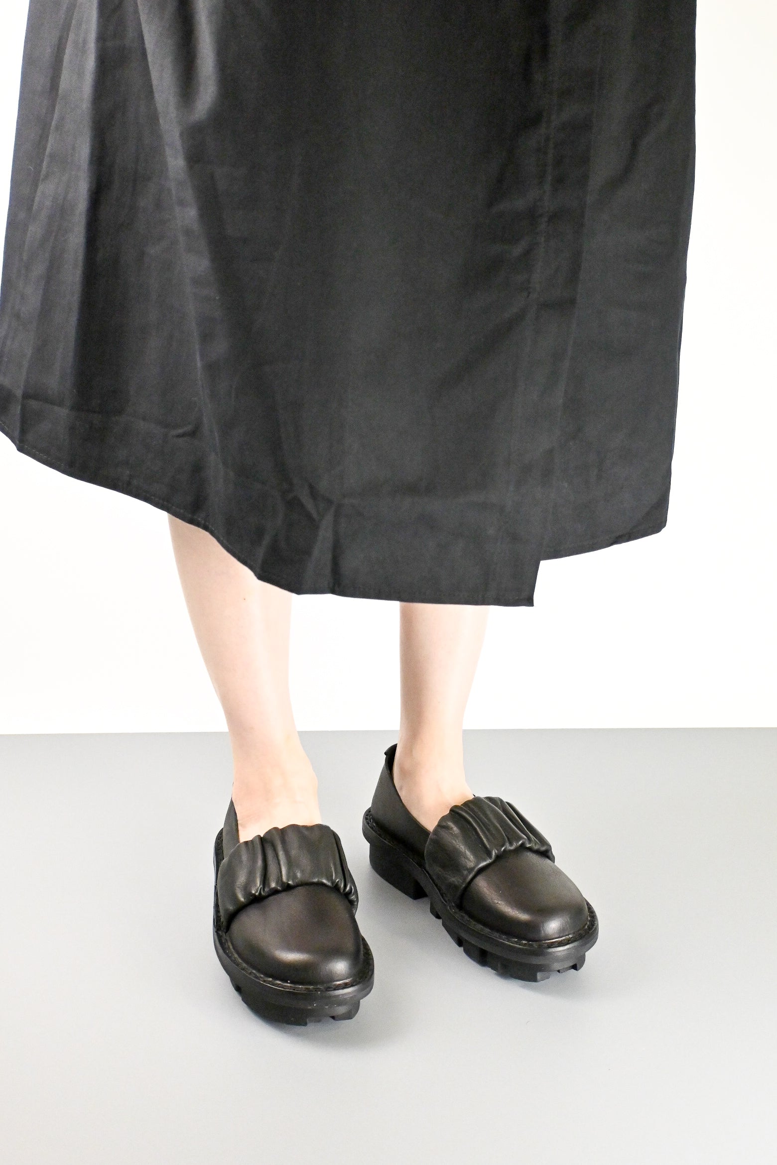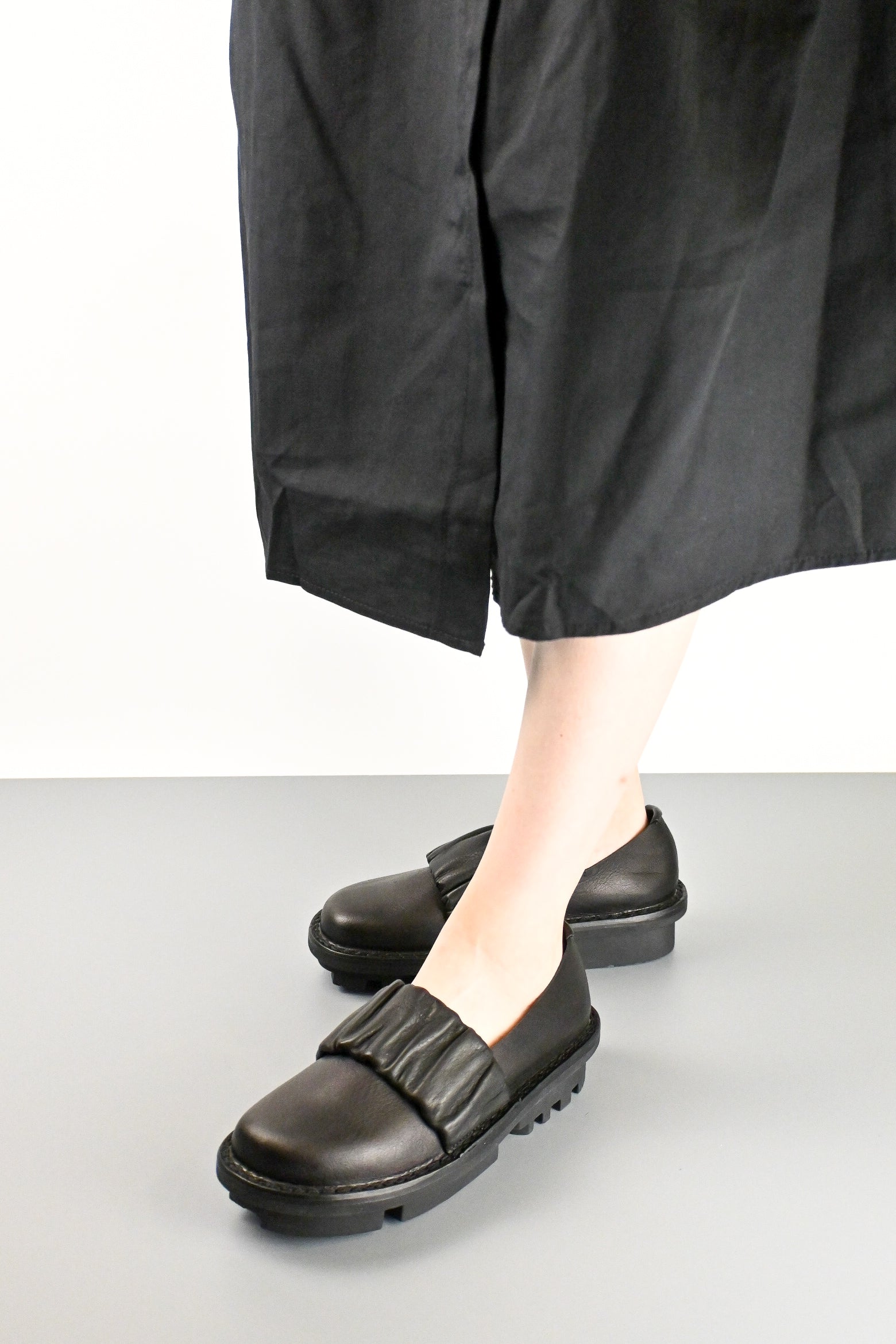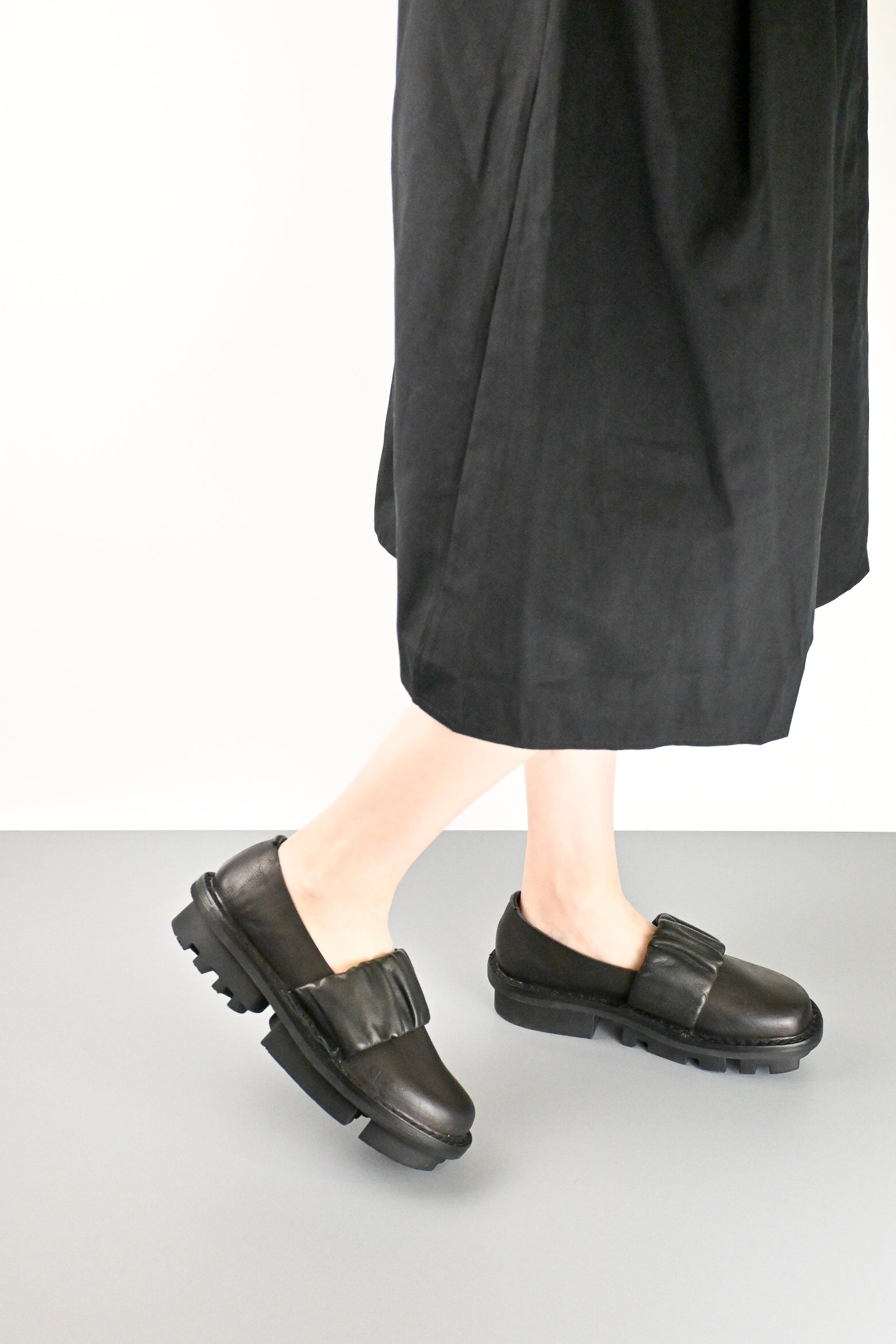 The Aim is a contemporary take on the classic ballerina, combining minimalist design with Trippen’s signature sculptural edge. Crafted from smooth black leather, it features a wide, leather-covered elasticated strap over the instep, offering both visual interest and a secure fit. The distinctive segmented rubber sole adds a bold, architectural element while ensuring flexibility and grip. Easy to slip on and exceptionally comfortable, the Aim includes a removable cork footbed that can be swapped for a thinner version. It is ideal for wider feet or custom insoles.