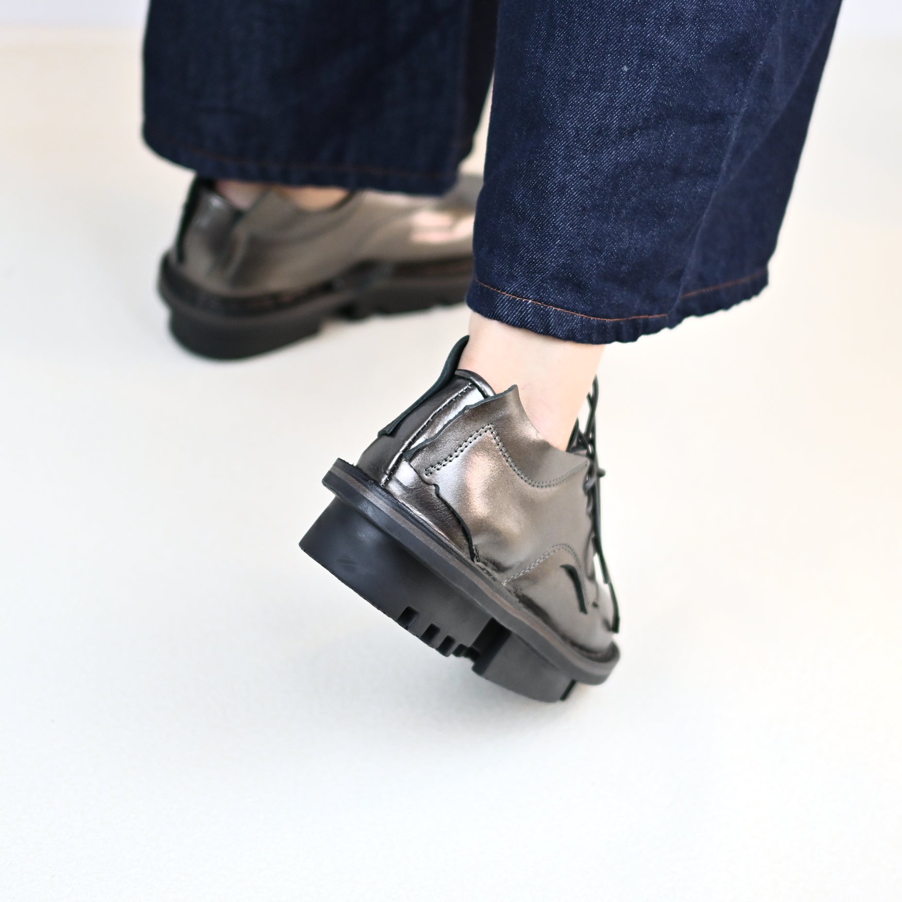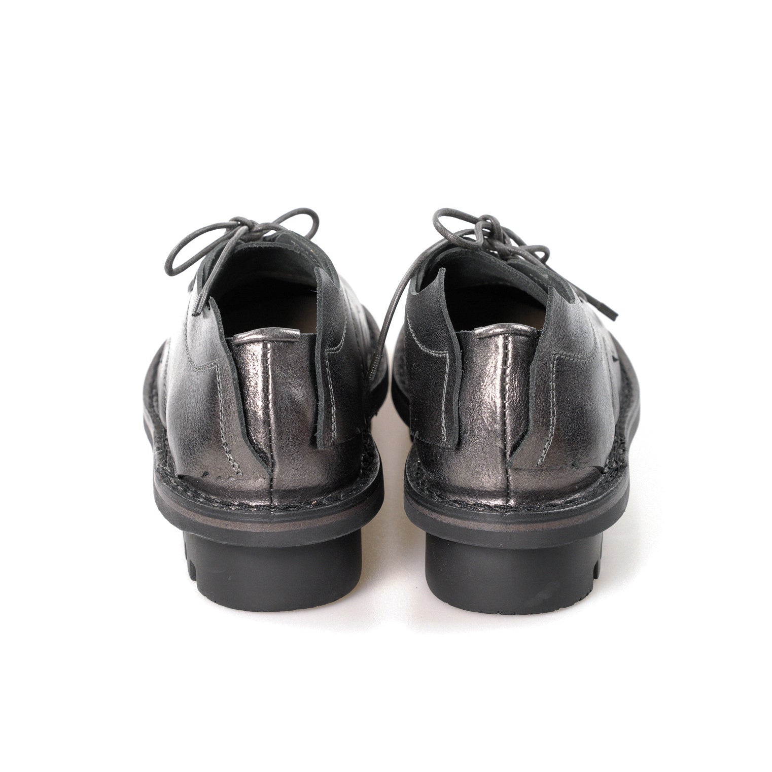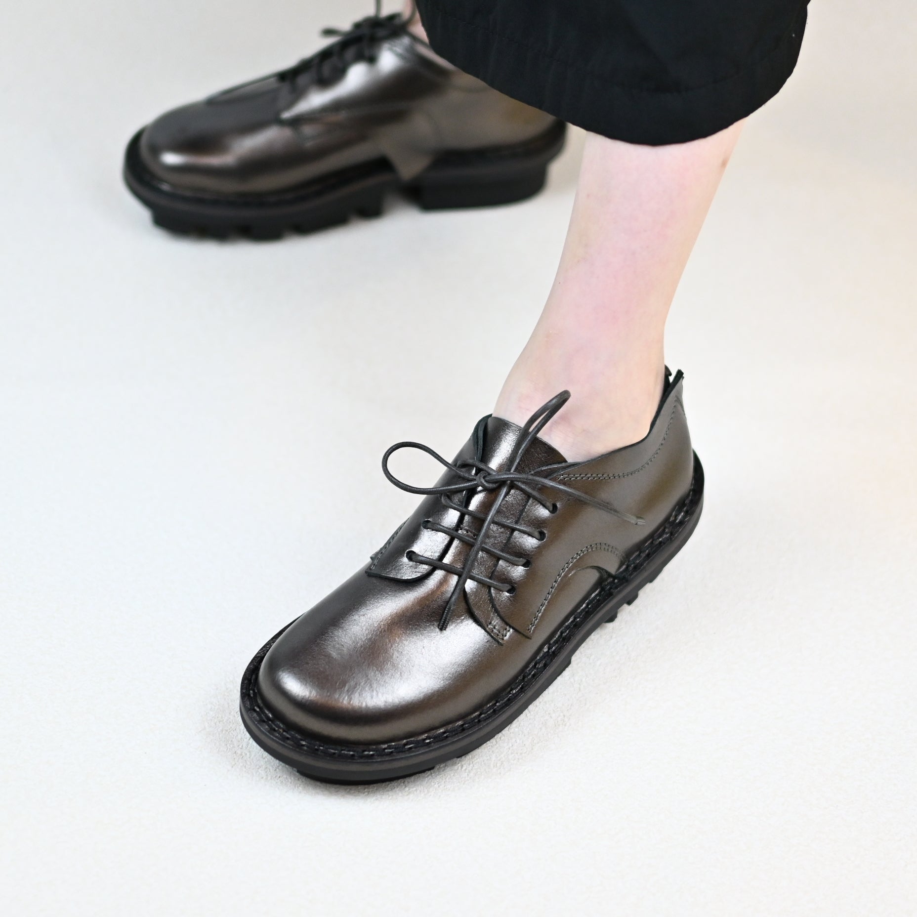 Becoming is a contemporary interpretation of the classic derby shoe, defined by a layered construction that balances form and function. The deconstructed derby section appears to float above the shoe, creating a sense of lightness while maintaining a secure structure. The traditional lacing anchors the foot, offering support and a customisable fit.