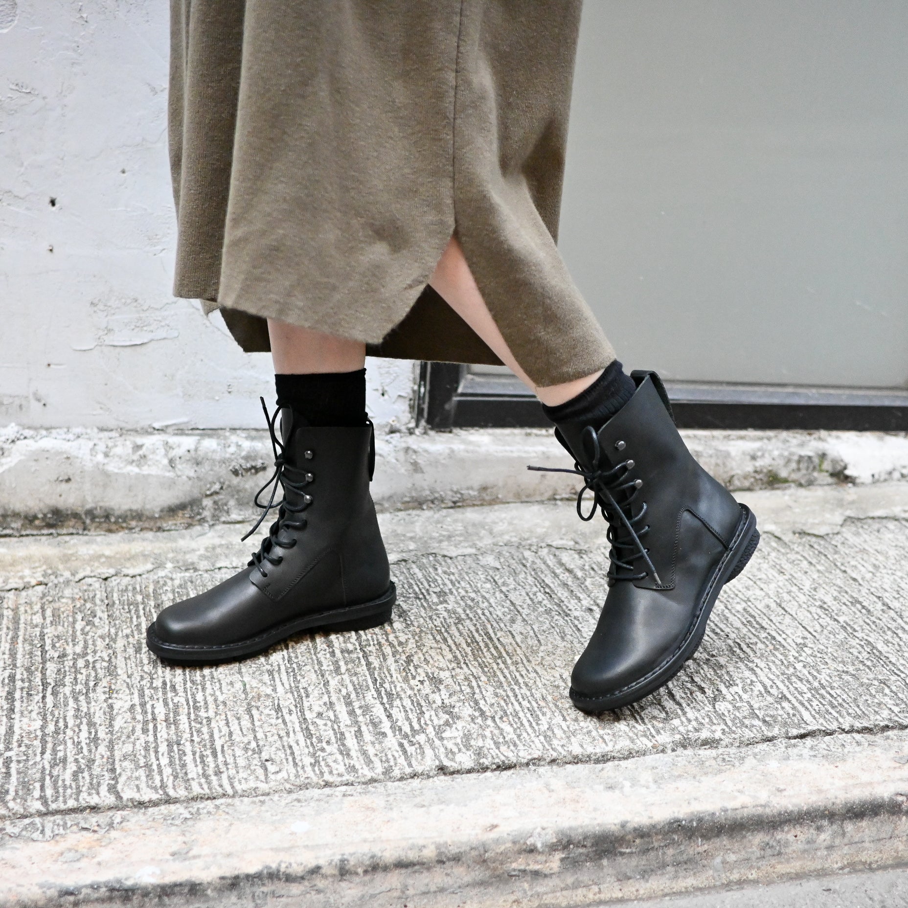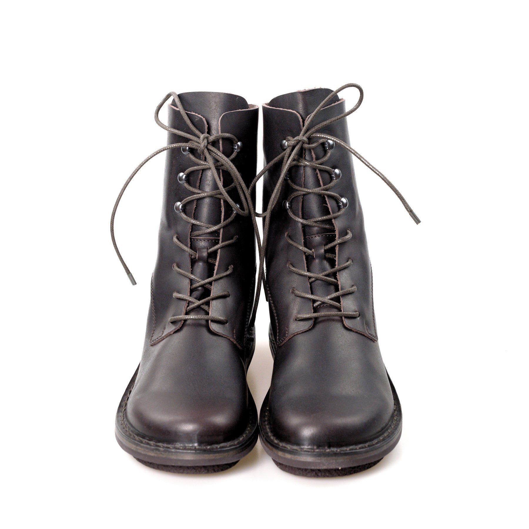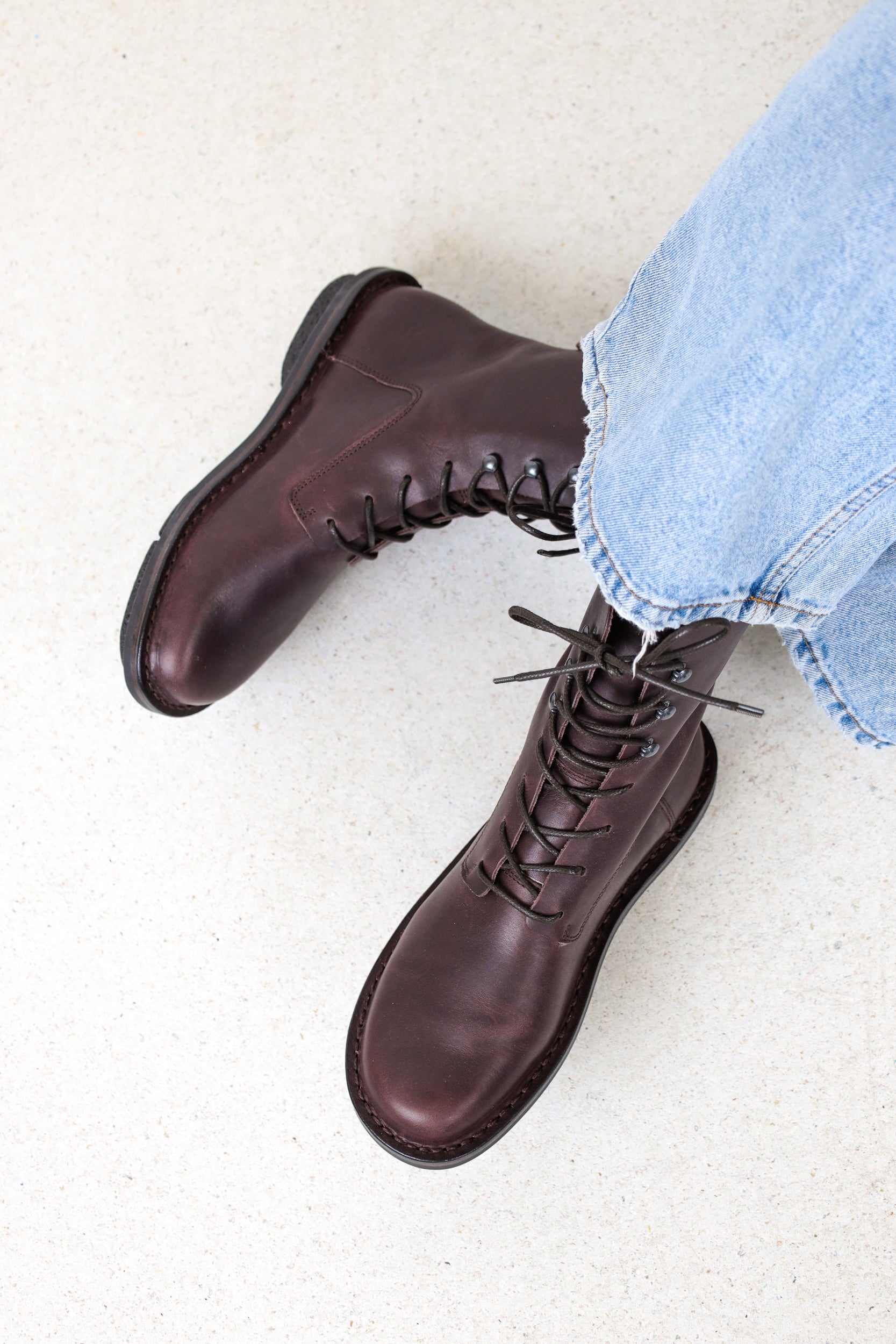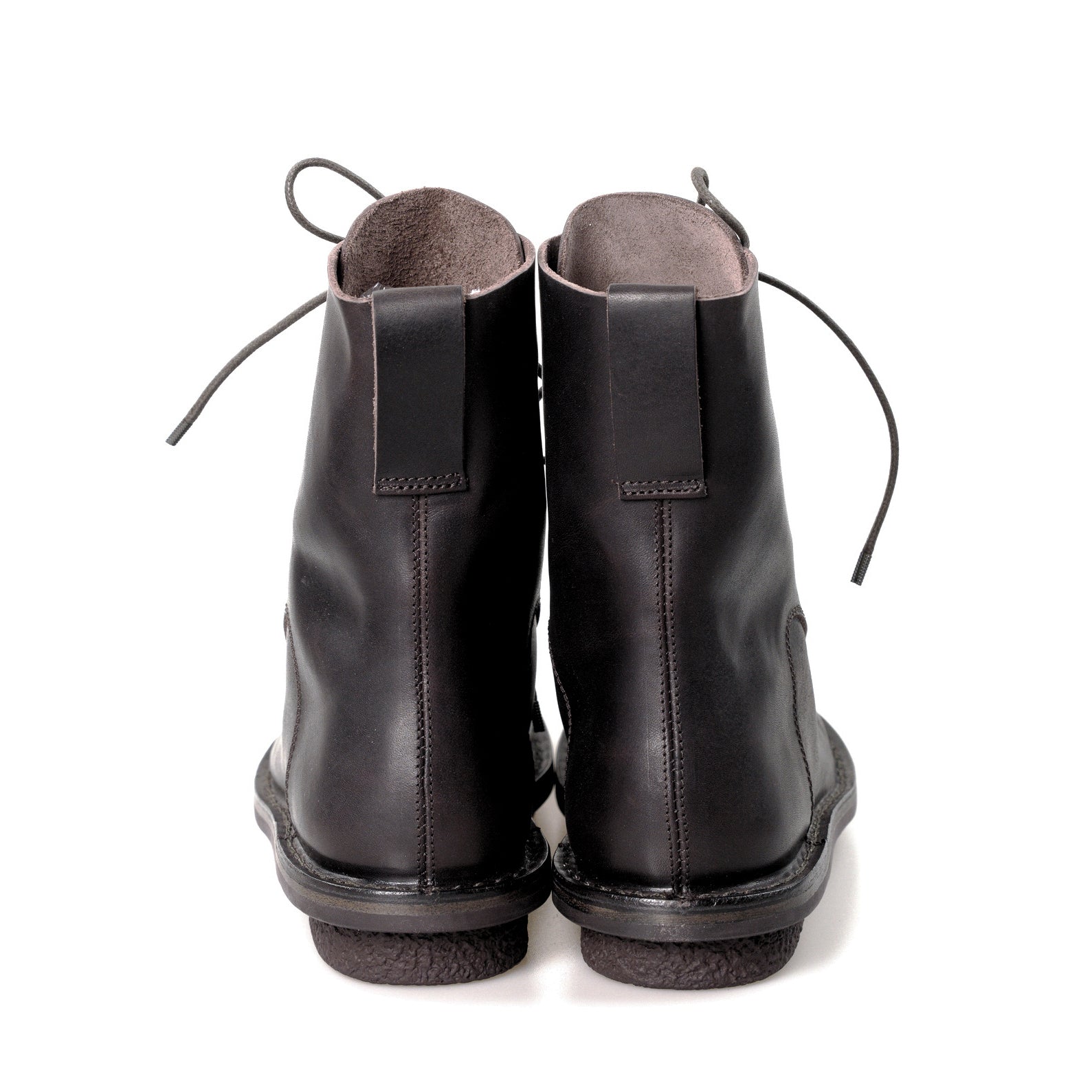 Bert is a mid-cut lace up boot designed with timeless lines and a supportive build. The smooth shaft rises above the ankle and fastens with a mix of traditional eyelets and metal speed hooks, offering both security and ease. The understated panel construction and gently rounded toe give the silhouette a clean, everyday appeal.