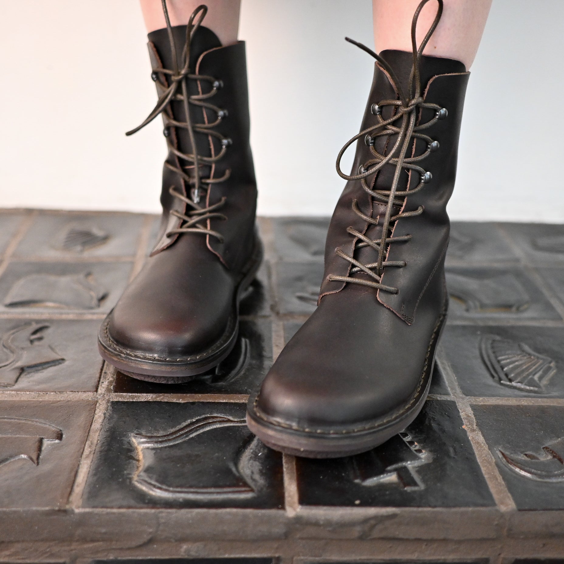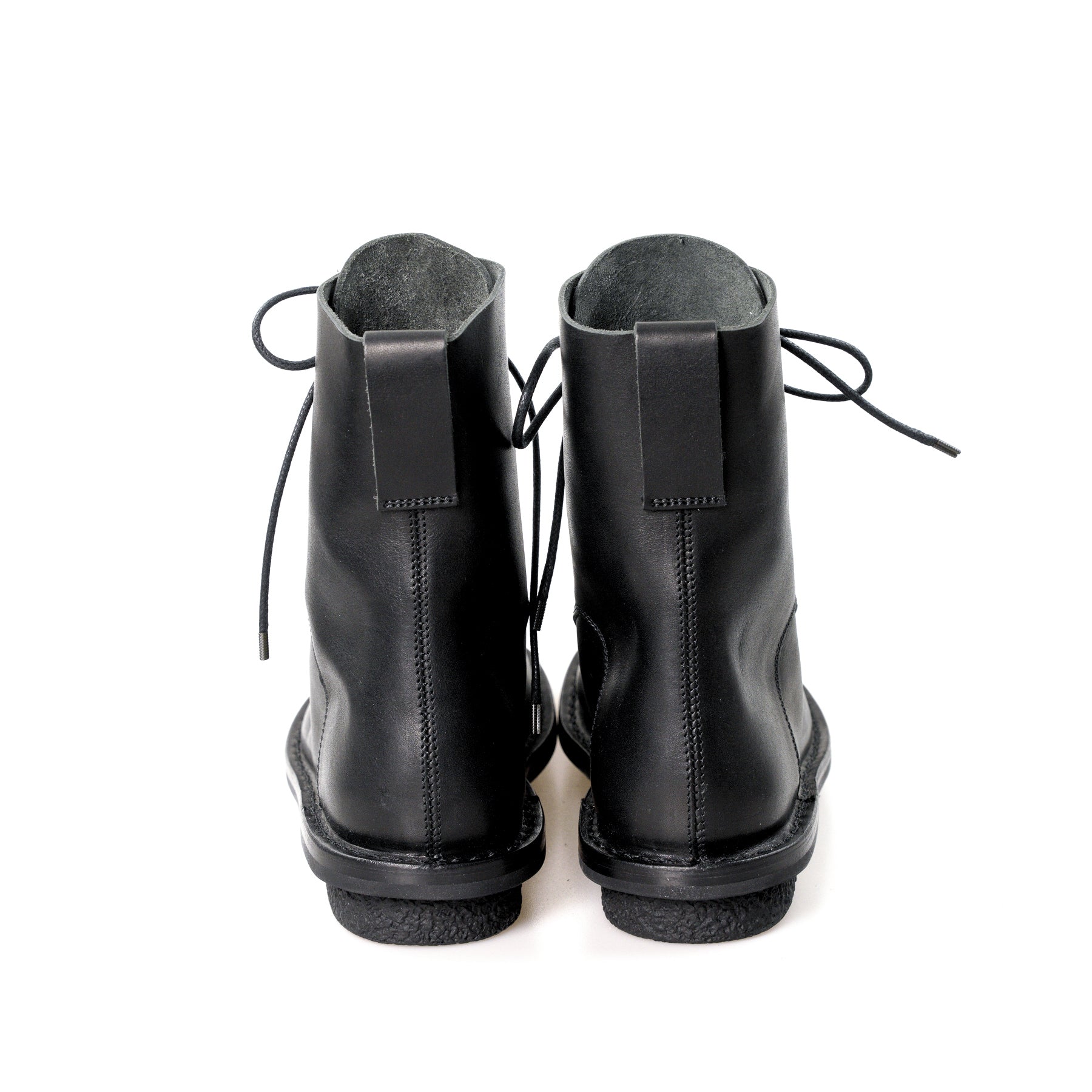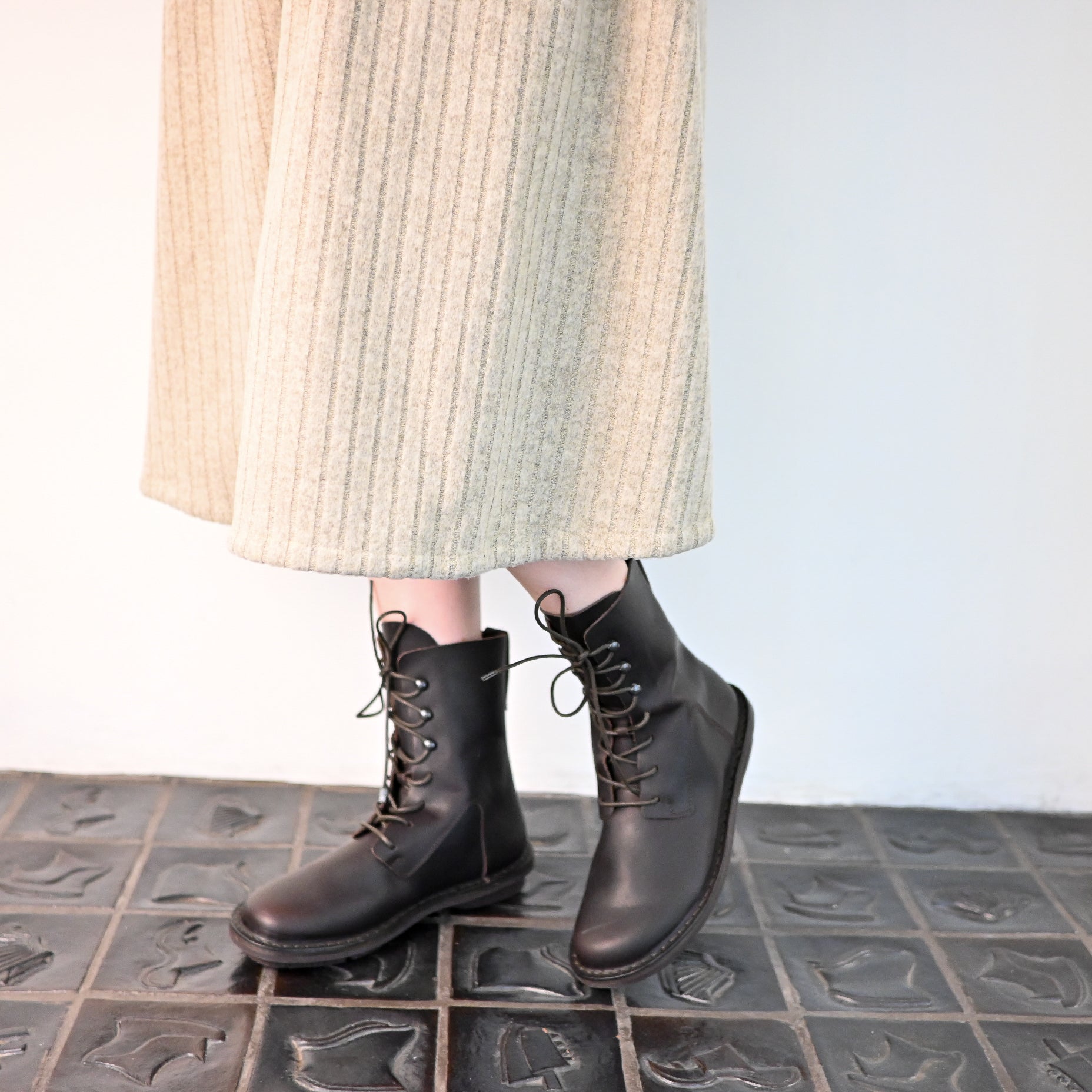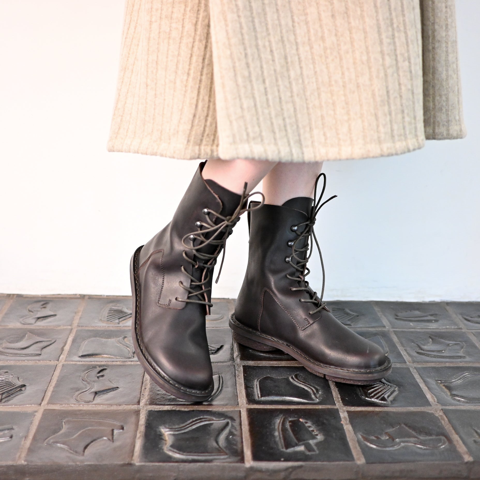 Bert is a mid-cut lace up boot designed with timeless lines and a supportive build. The smooth shaft rises above the ankle and fastens with a mix of traditional eyelets and metal speed hooks, offering both security and ease. The understated panel construction and gently rounded toe give the silhouette a clean, everyday appeal.