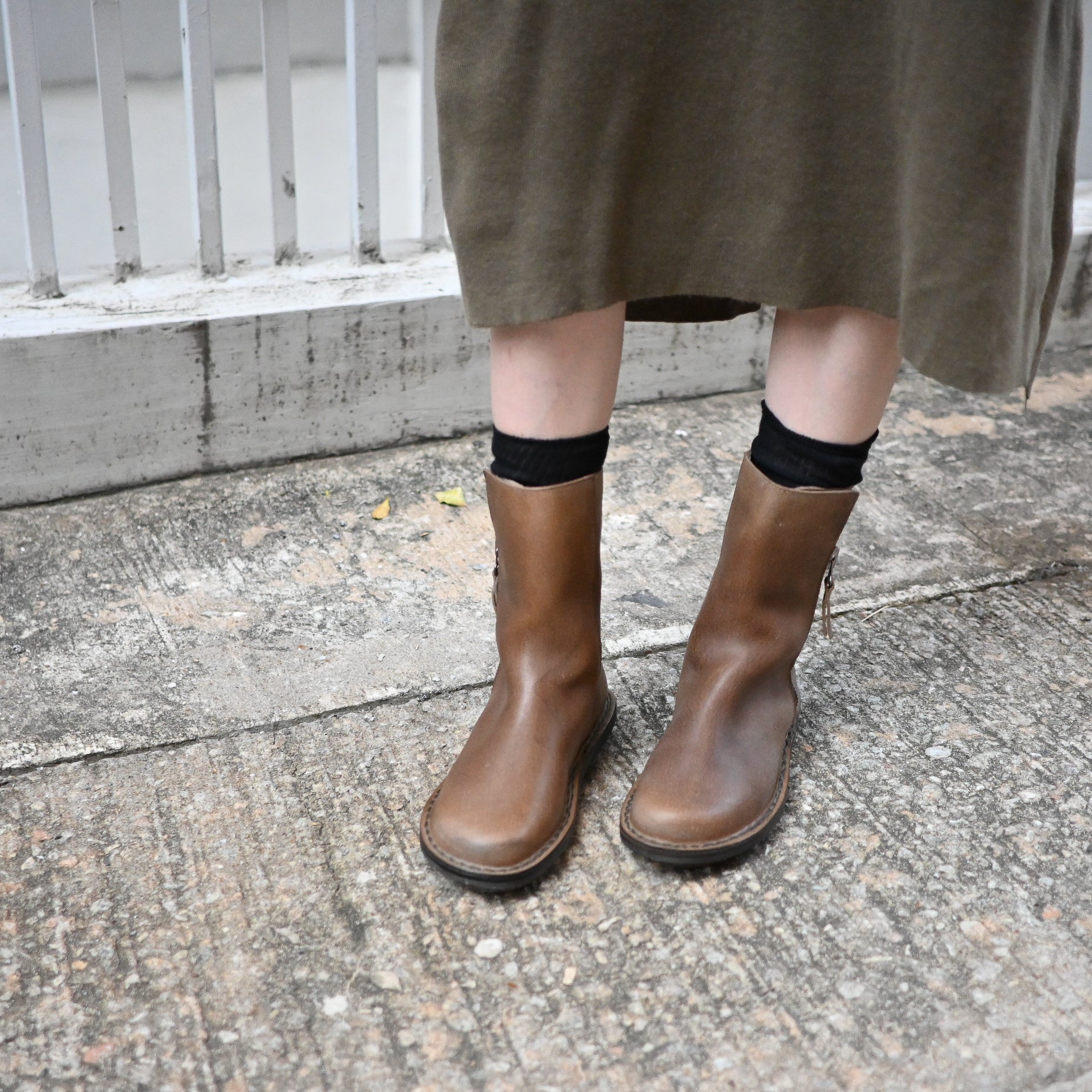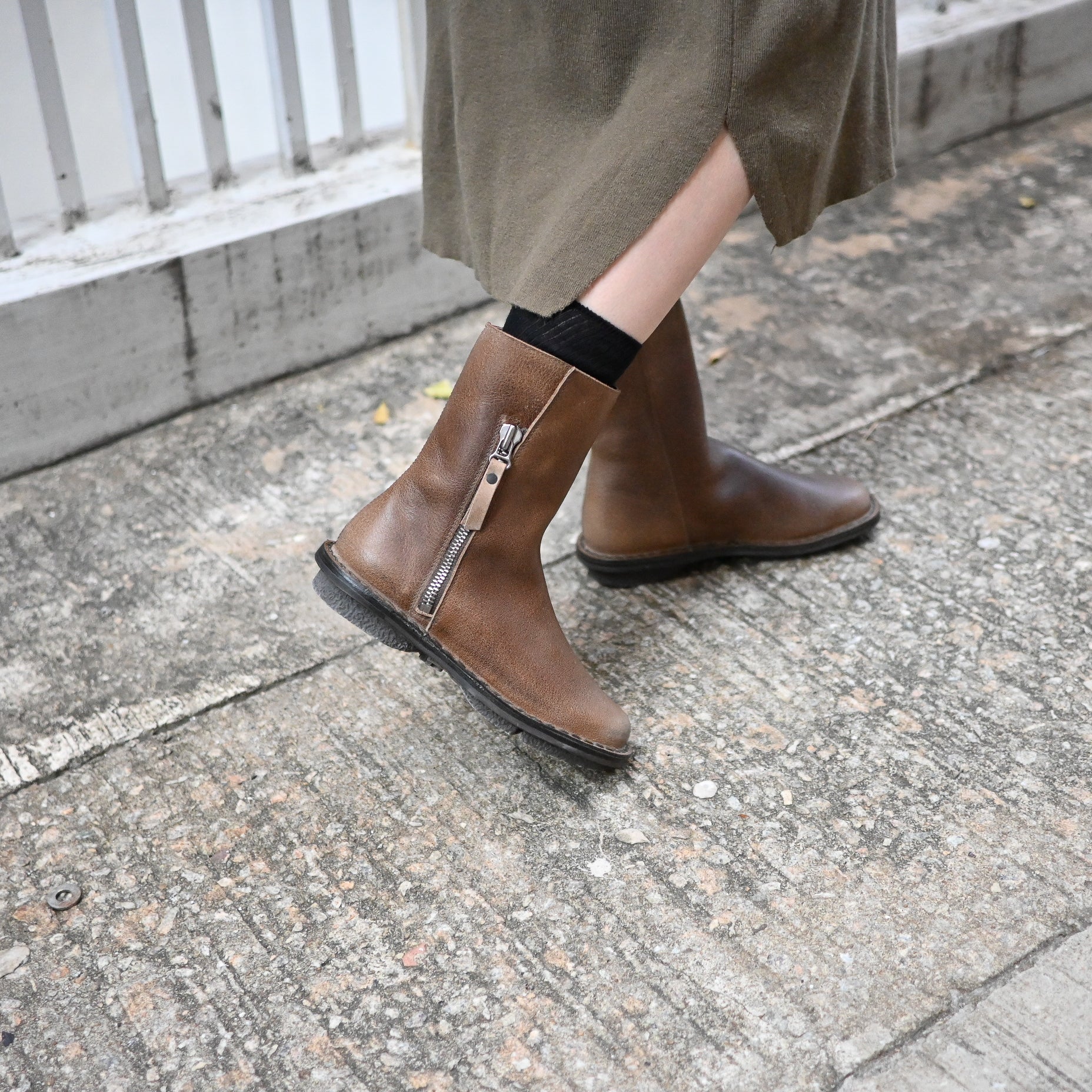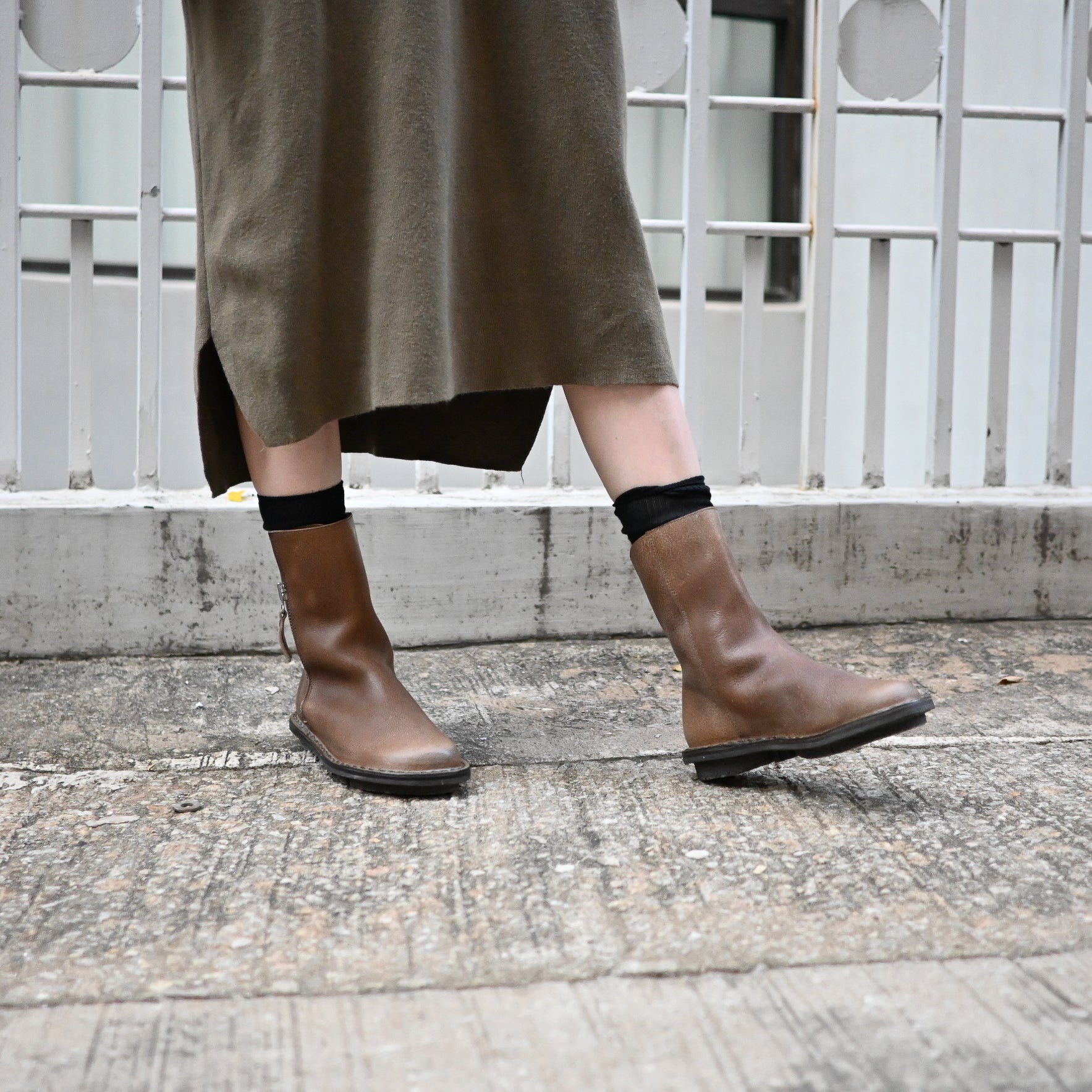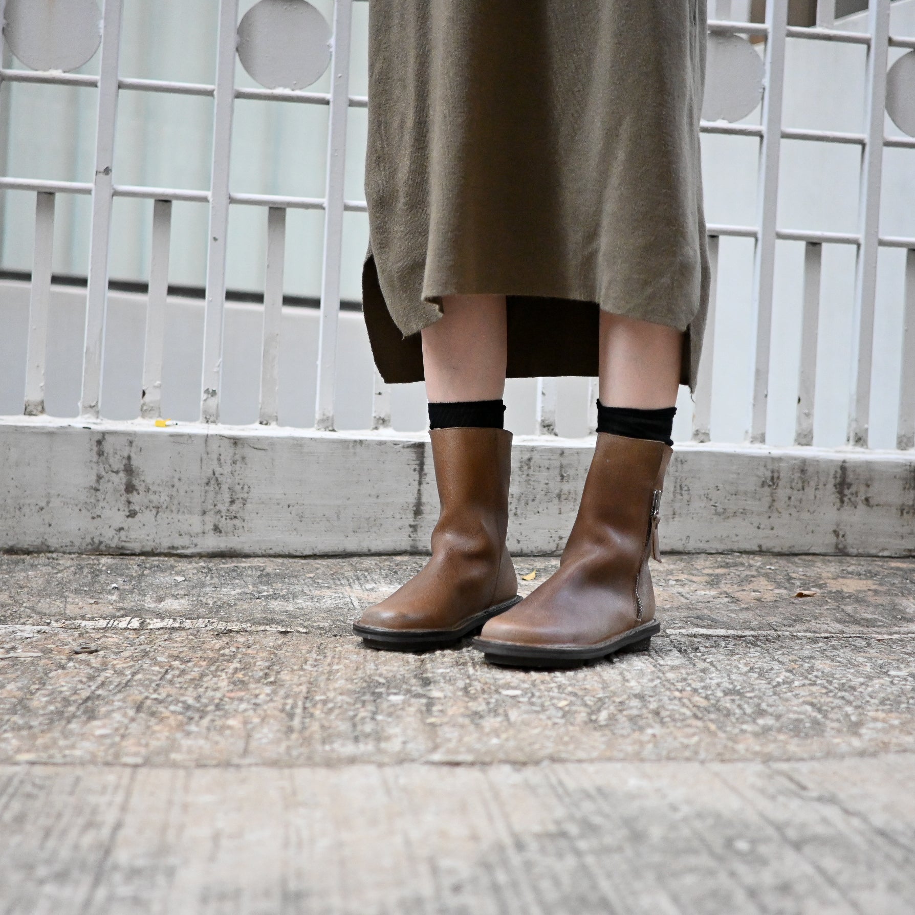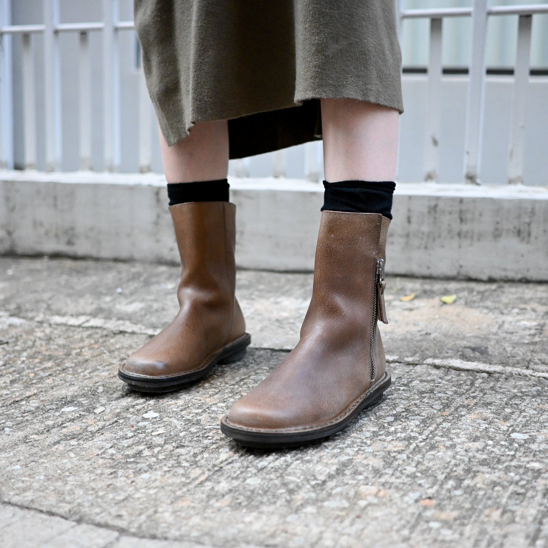 Deer is a sleek mid-height boot with a refined silhouette and easy everyday function. The smooth leather upper is shaped with a gentle curve that rises just above the ankle, while a full-length metal side zipper allows for quick access and a clean finish. The absence of visible stitching on the front enhances the boot’s minimal and sculpted look.