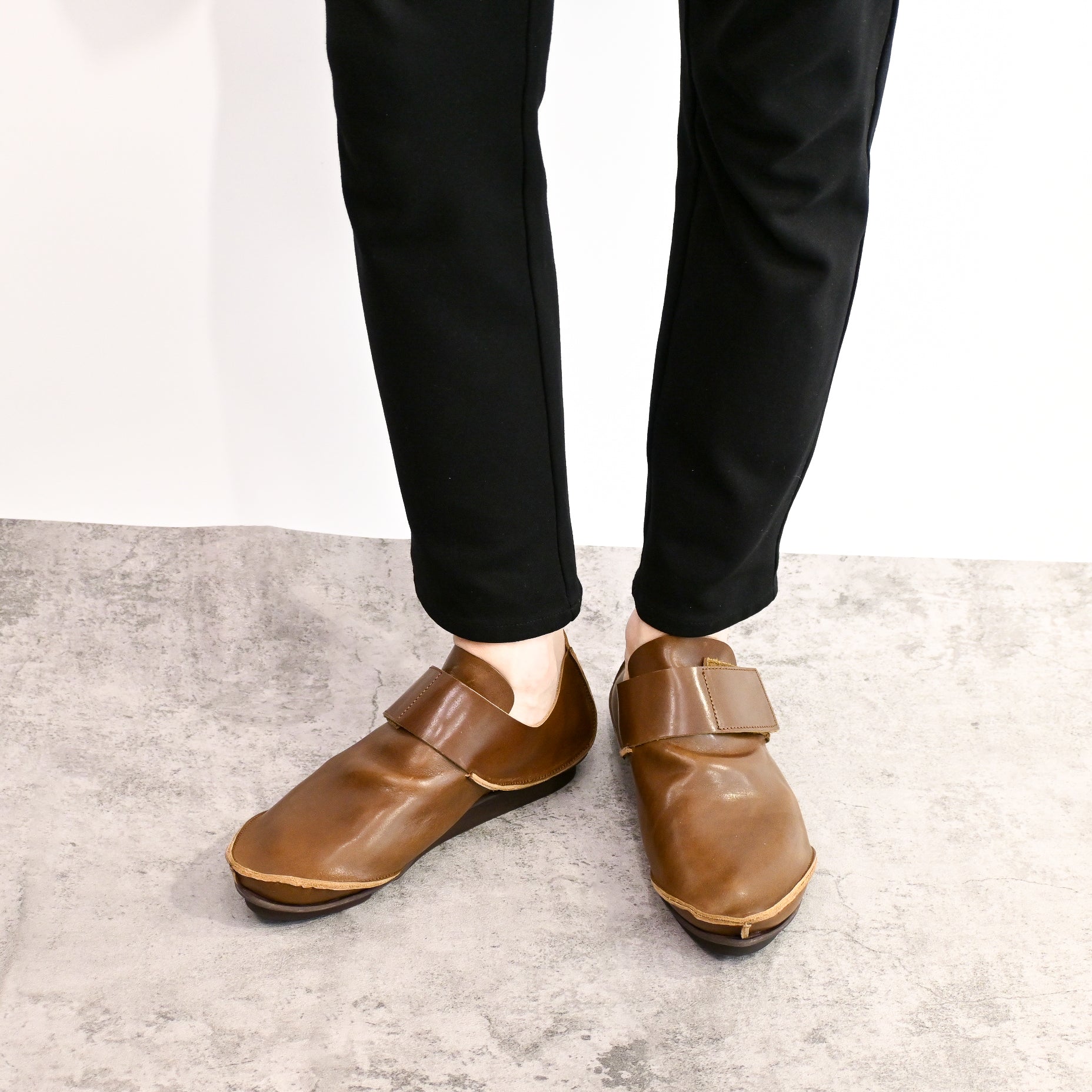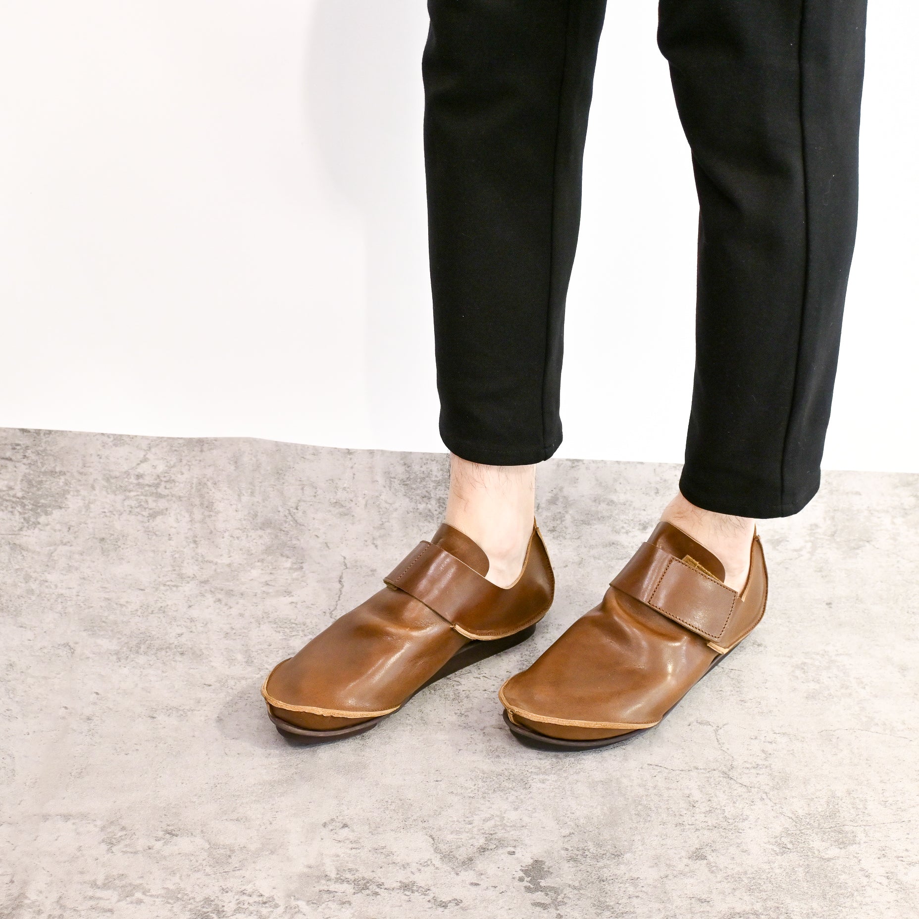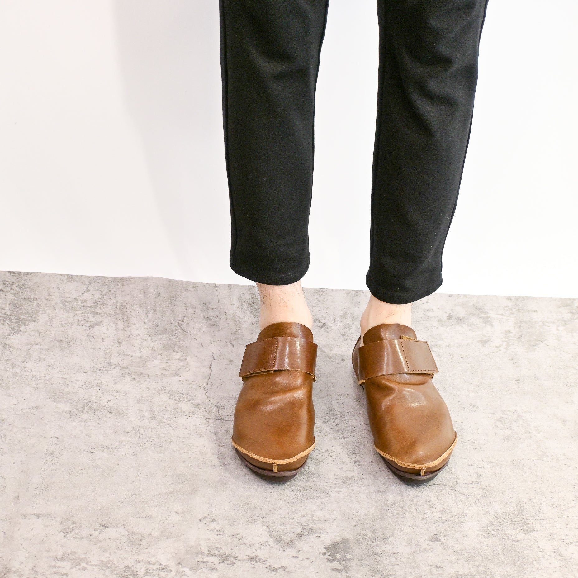 The Enigma is a sleek, futuristic slip-on shoe featuring an asymmetrical design with a wide, secure Velcro strapacross the instep. The sculpted form and curved, upturned toe create a unique, avant-garde silhouette, making it a standout piece.