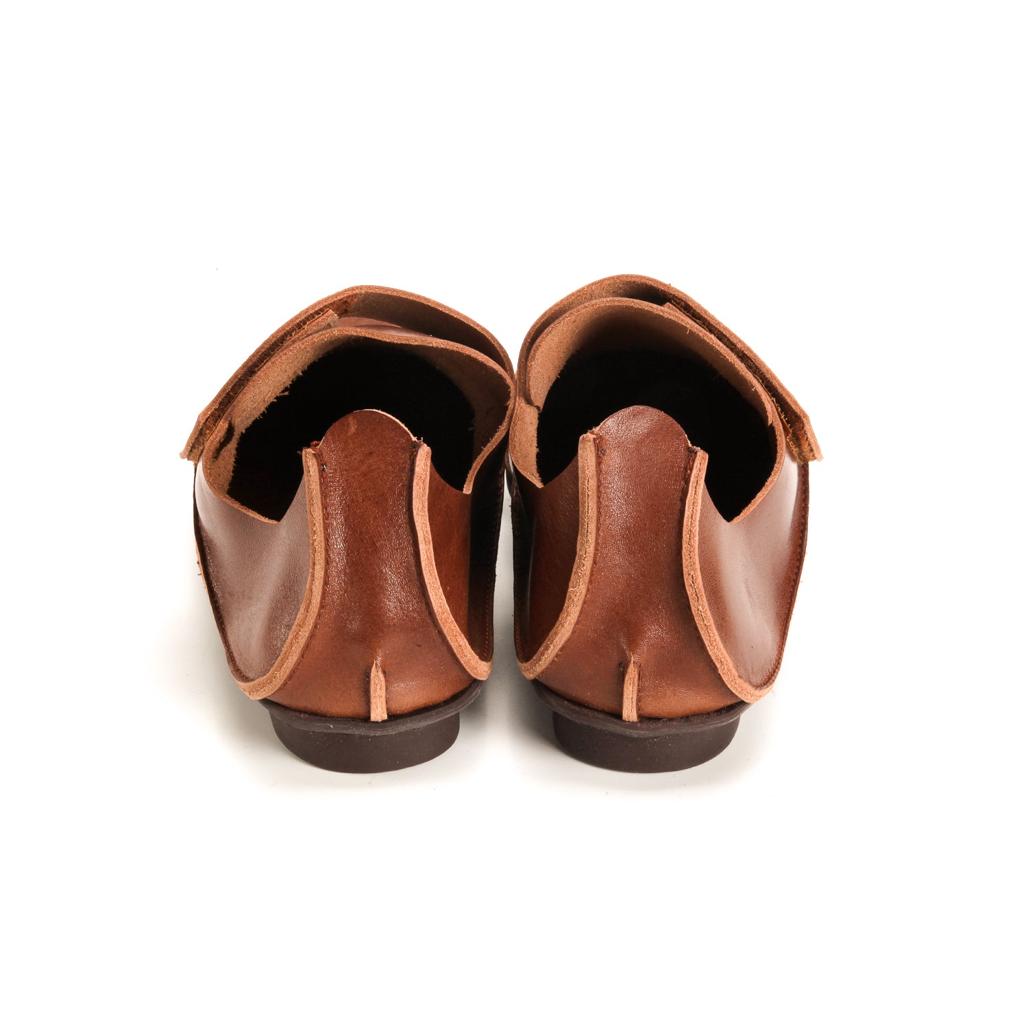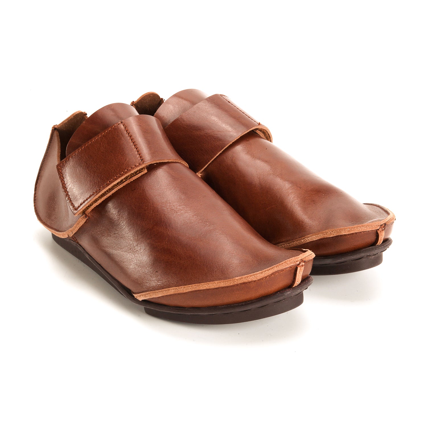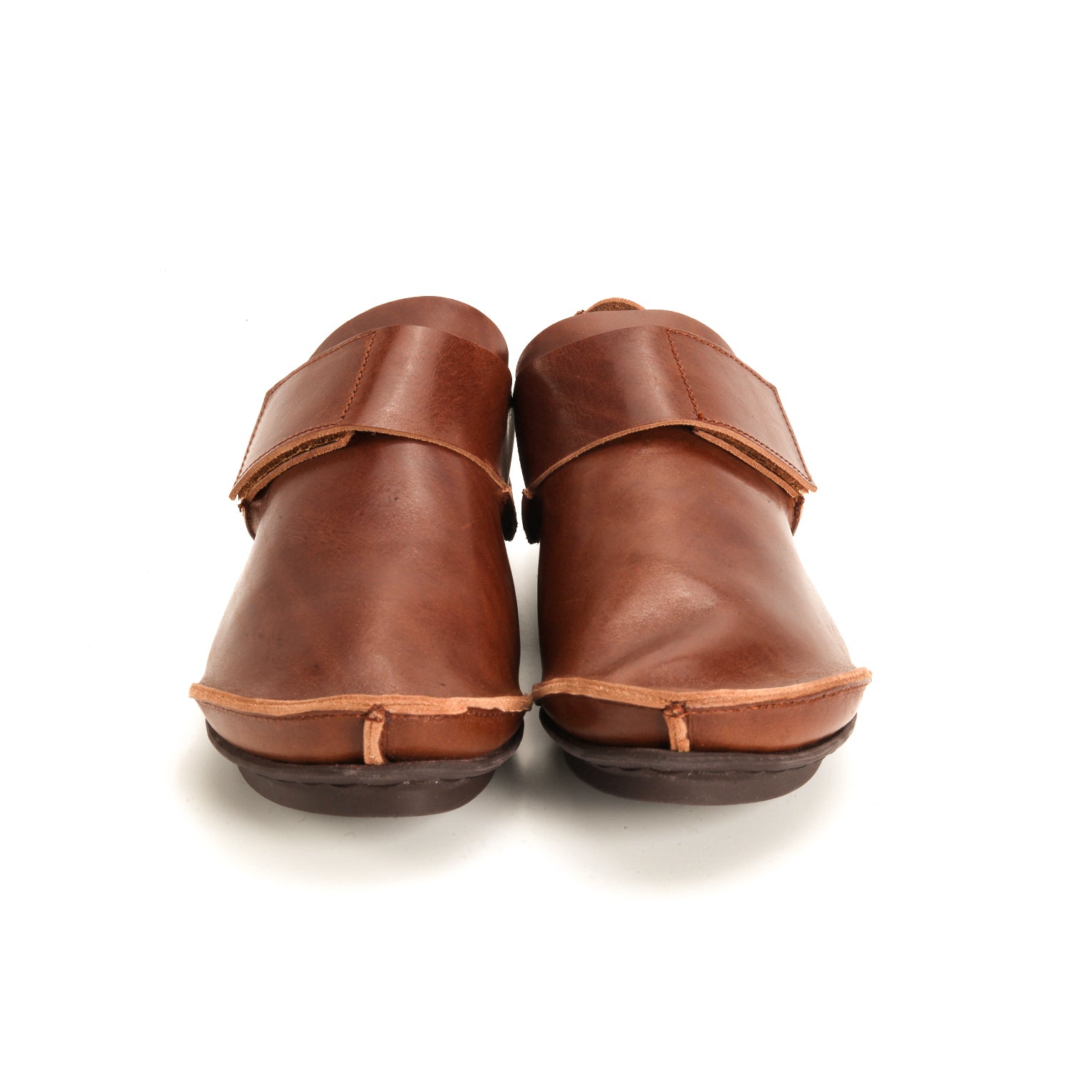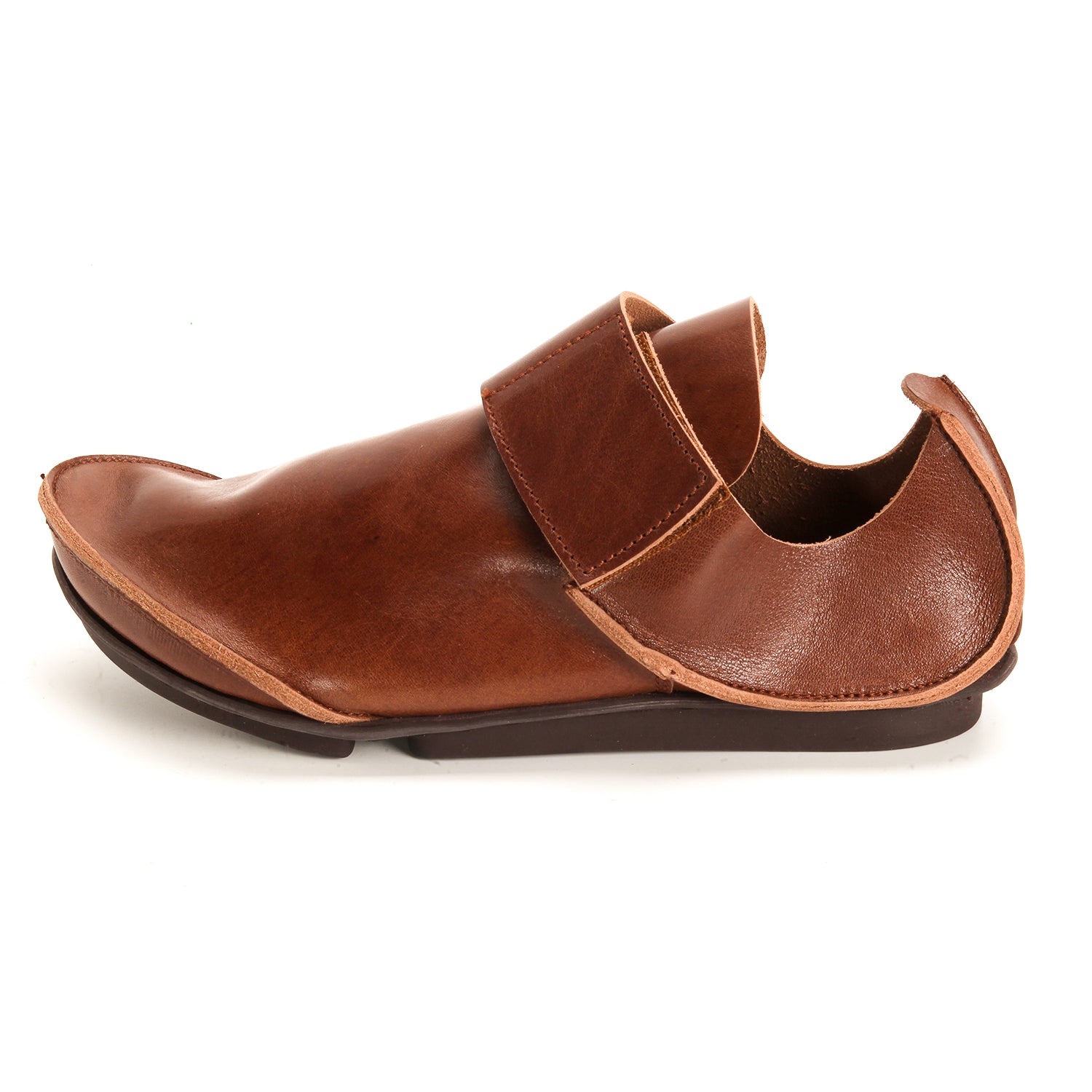 The Enigma is a sleek, futuristic slip-on shoe featuring an asymmetrical design with a wide, secure Velcro strapacross the instep. The sculpted form and curved, upturned toe create a unique, avant-garde silhouette, making it a standout piece.