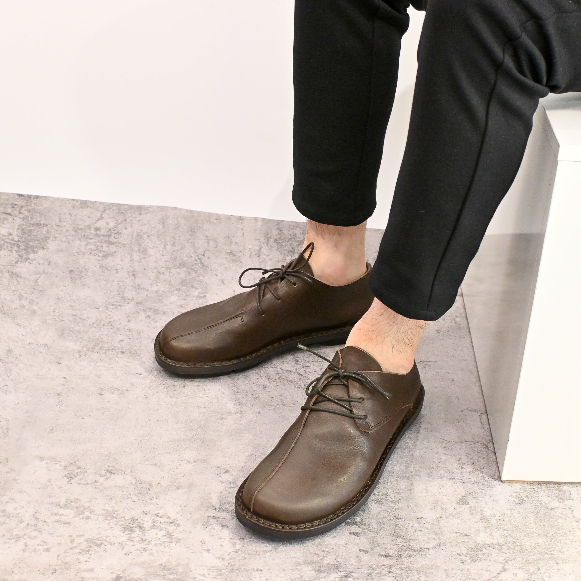 The Gangster is a refined low-cut lace-up shoe that seamlessly blends classic elegance with a modern twist. Its asymmetric design and unique center seam on the vamp add a subtle yet distinctive touch to its timeless silhouette. Crafted from high-quality black leather, it offers durability, comfort, and a sleek, polished aesthetic. Hand-stitched details further emphasize its expert craftsmanship, making it an excellent choice for those who appreciate understated sophistication.