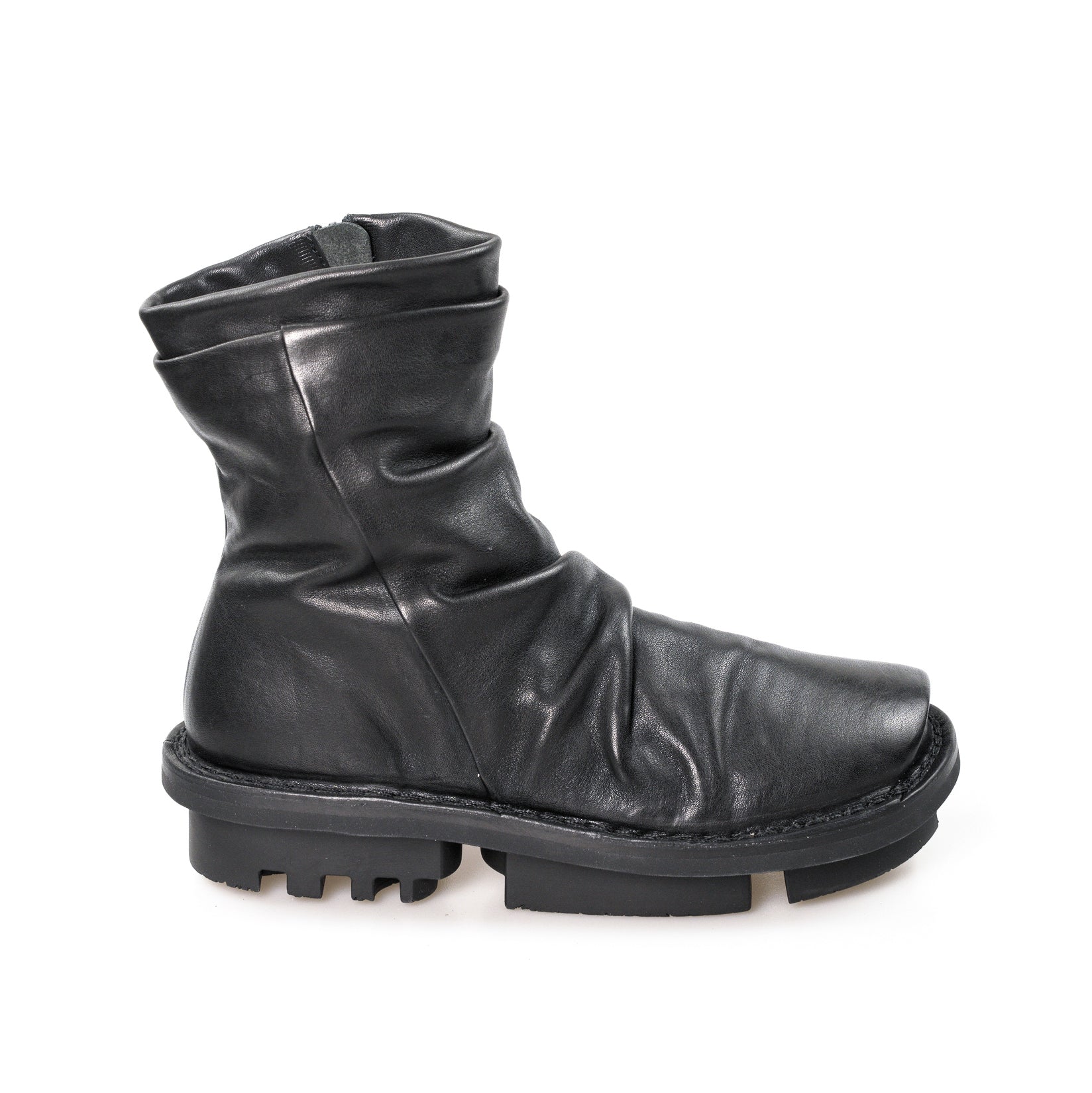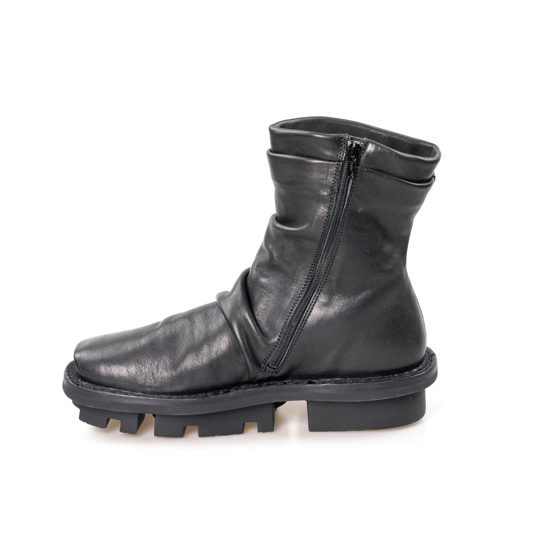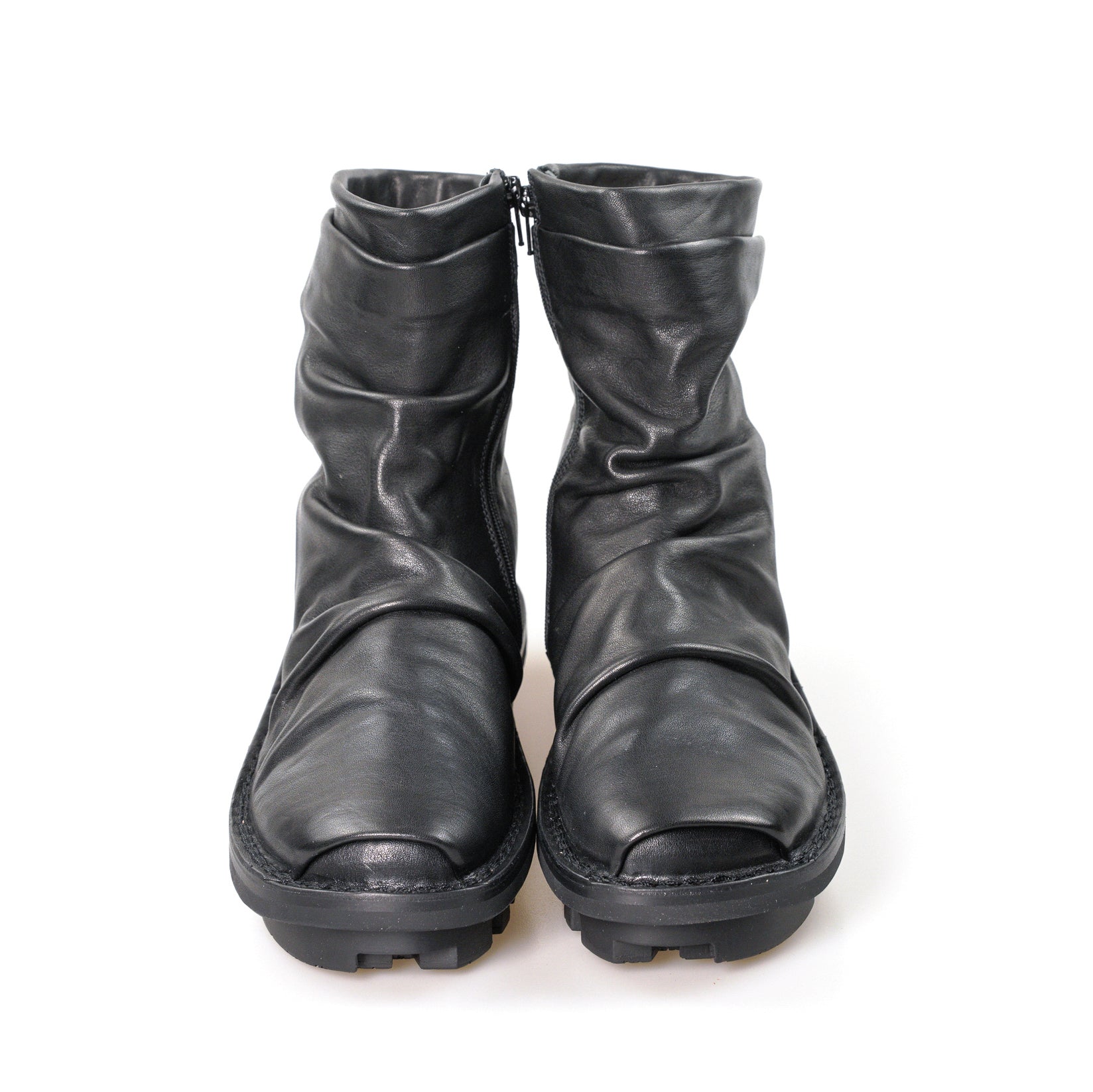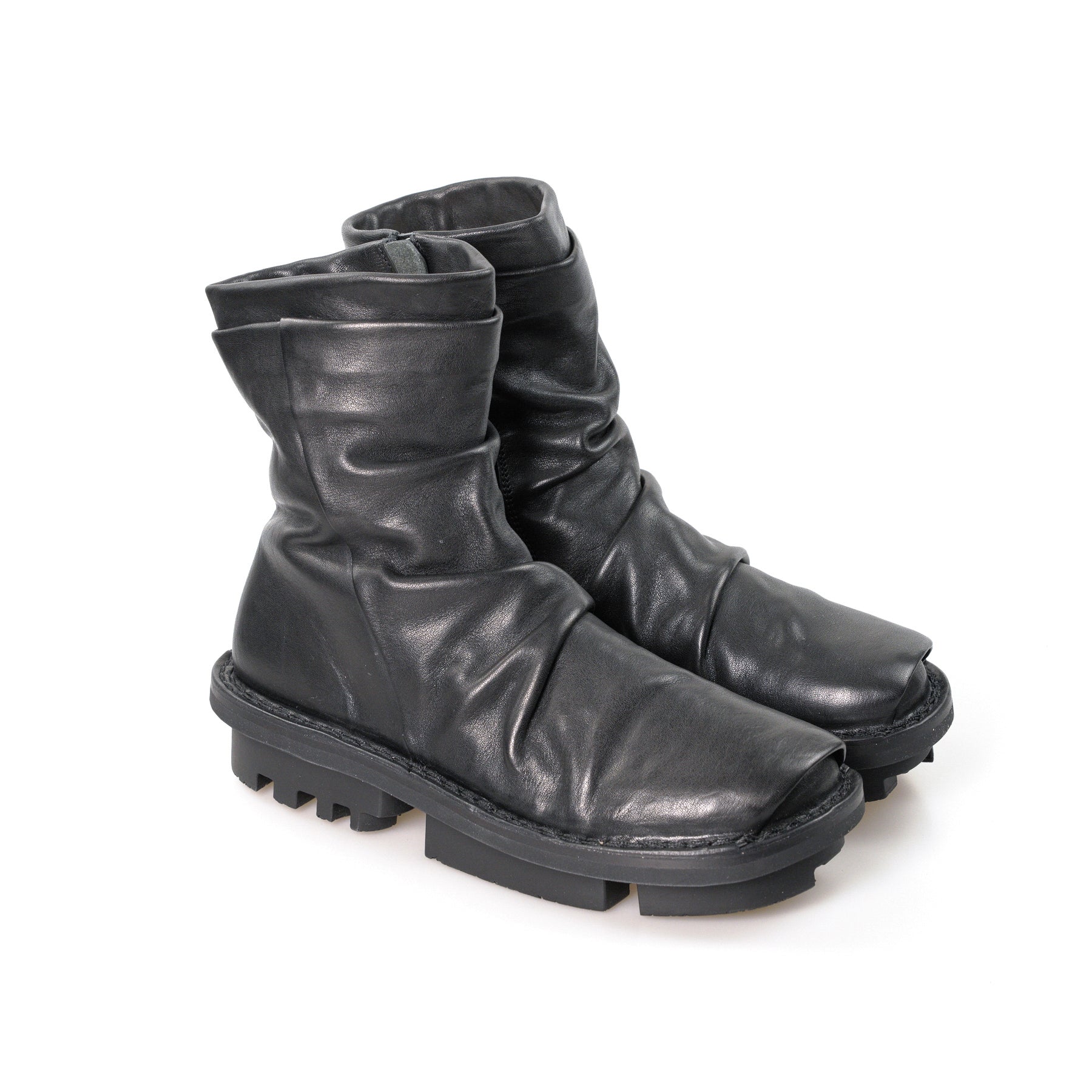 Juice is a mid-height boot defined by its sculptural folds and bold profile. Between two simple folded edges over the toe and at the end of the shaft, the leather lies in flowing, natural drapes that soften the structured shape. The clean seam placement and slightly asymmetrical lines create a look that is both expressive and minimal.
