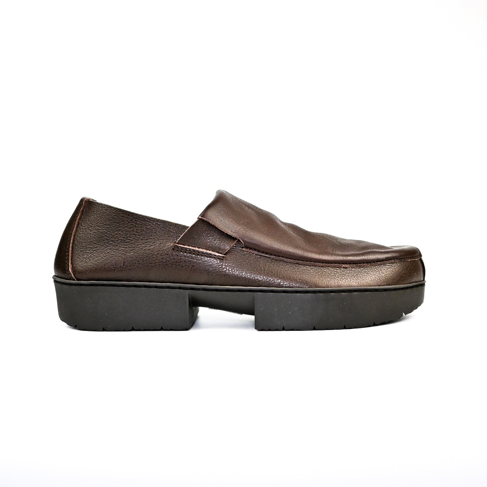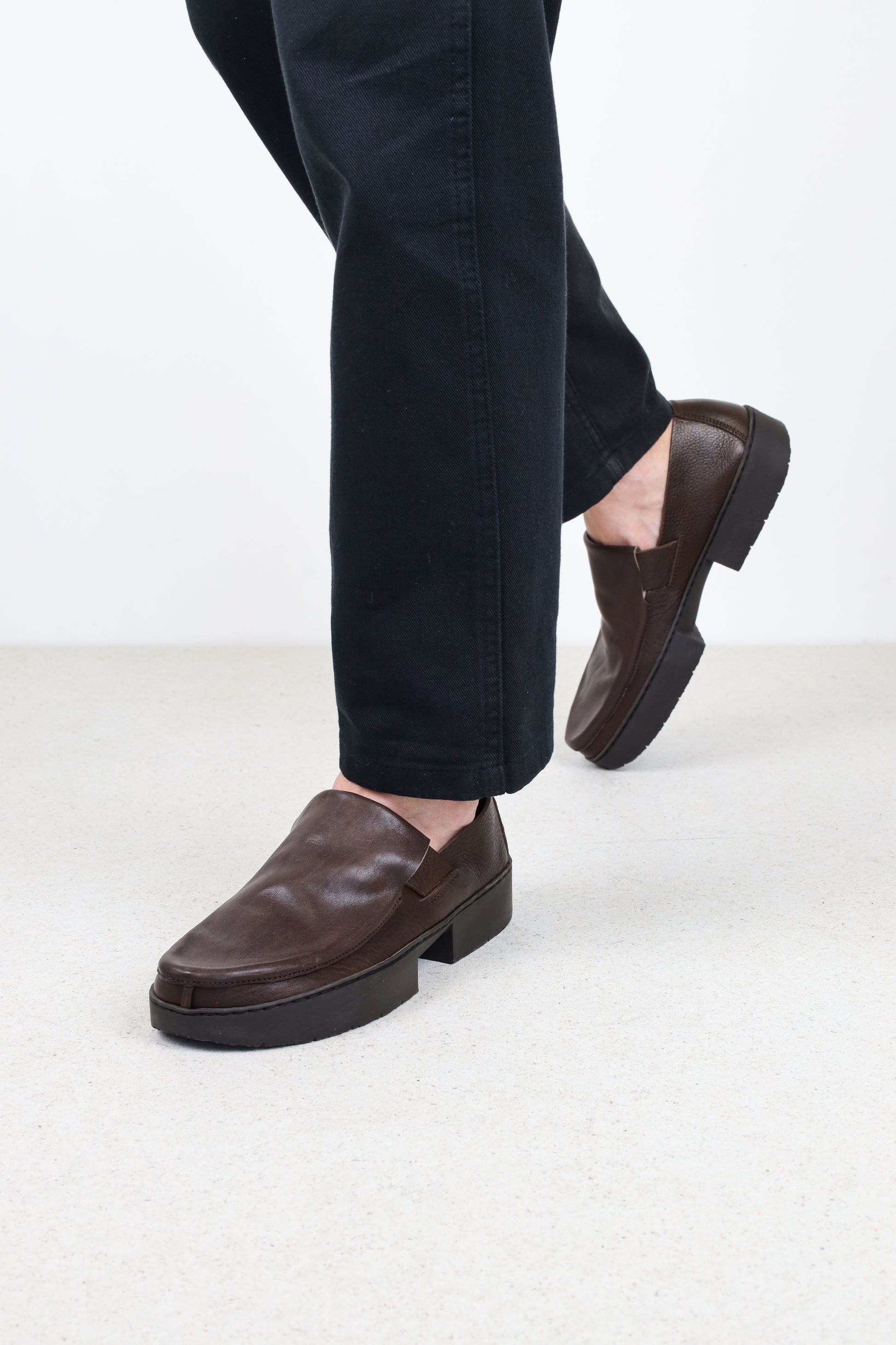 A clean slip-on shoe with a refined, understated profile, Loyal is defined by its smooth upper and gently rounded toe. The minimal construction is complemented by a subtle strap detail across the instep, adding structure while keeping the design calm and timeless. Its low silhouette makes it easy to style for both everyday and more polished looks.