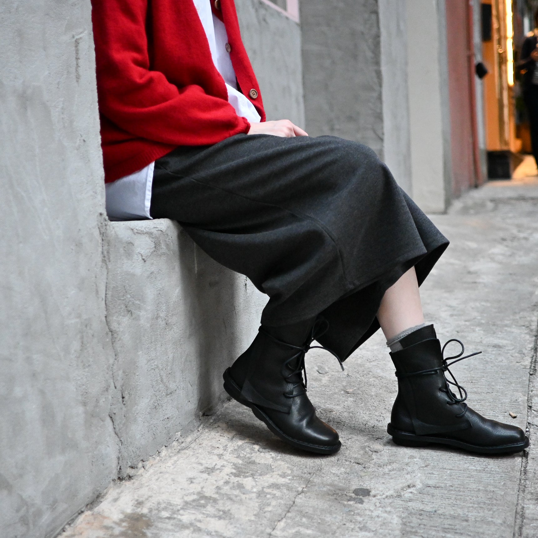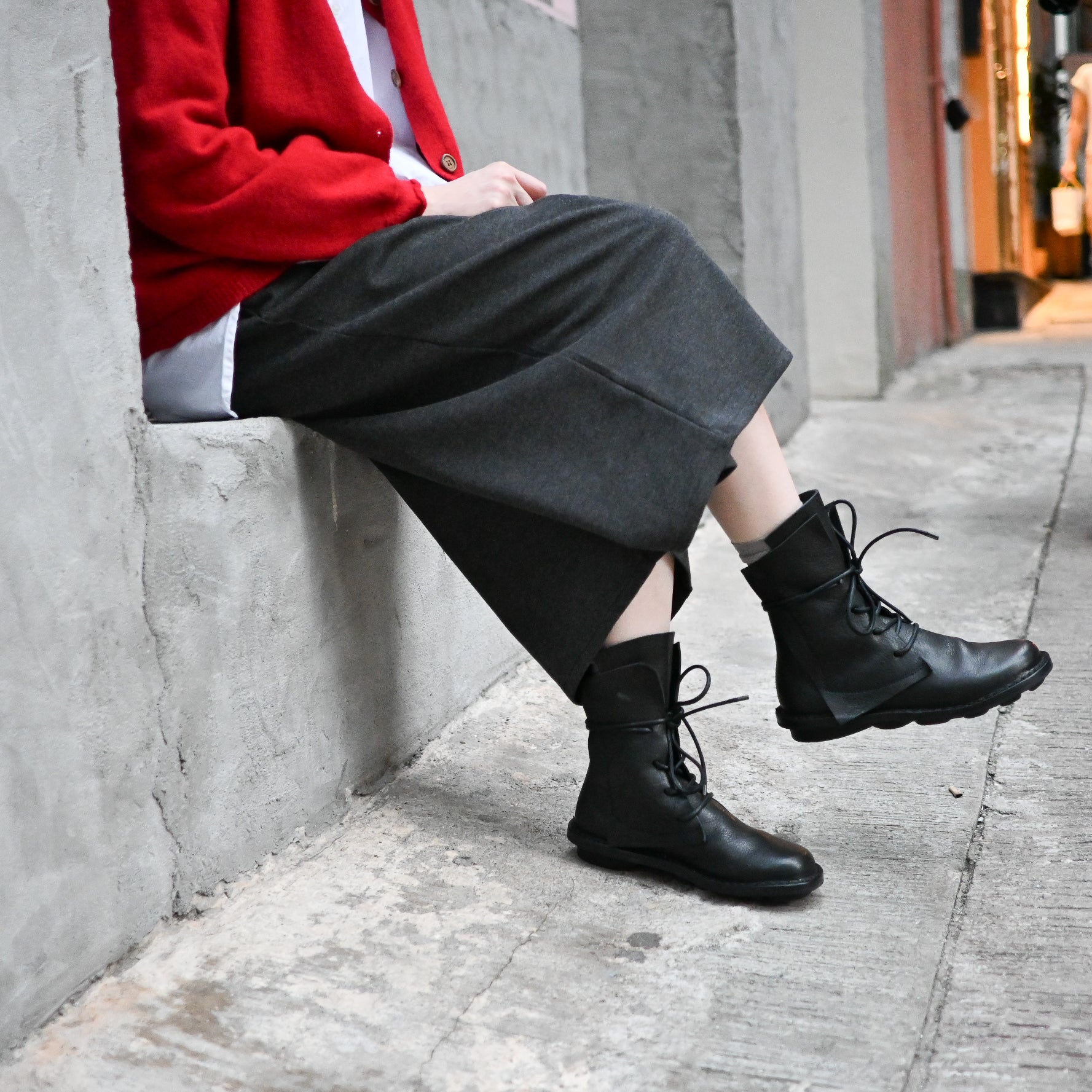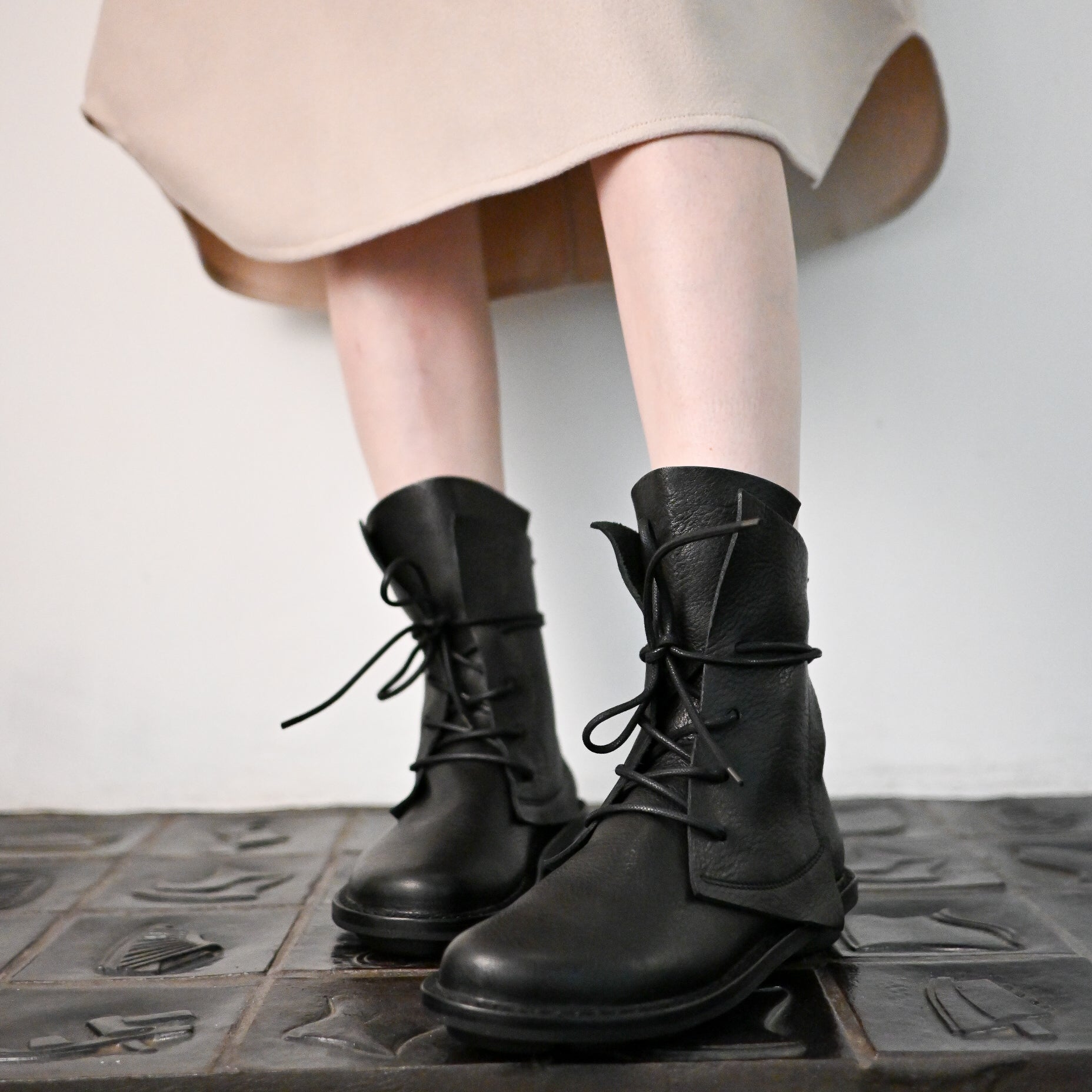 The Rectangle style is a bold, avant-garde lace-up boot featuring an asymmetrical layered flap that forms a distinctive rectangular shape, creating a unique and striking silhouette. The geometric design adds an artistic, architectural element, while the extended lacing system ensures a secure and adjustable fit. The low-profile yet sturdy sole provides both stability and comfort, making it an excellent choice for those who appreciate cutting-edge, fashion-forward footwear.