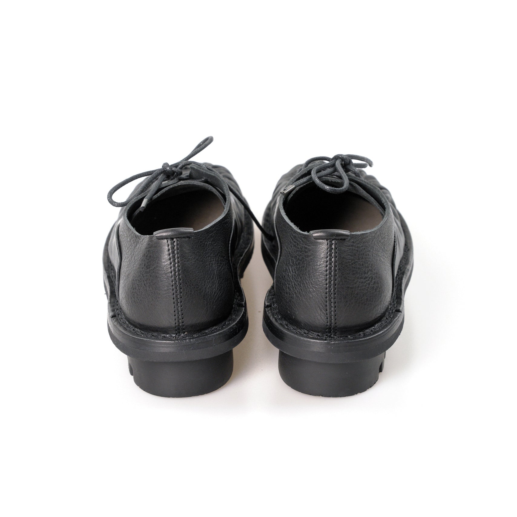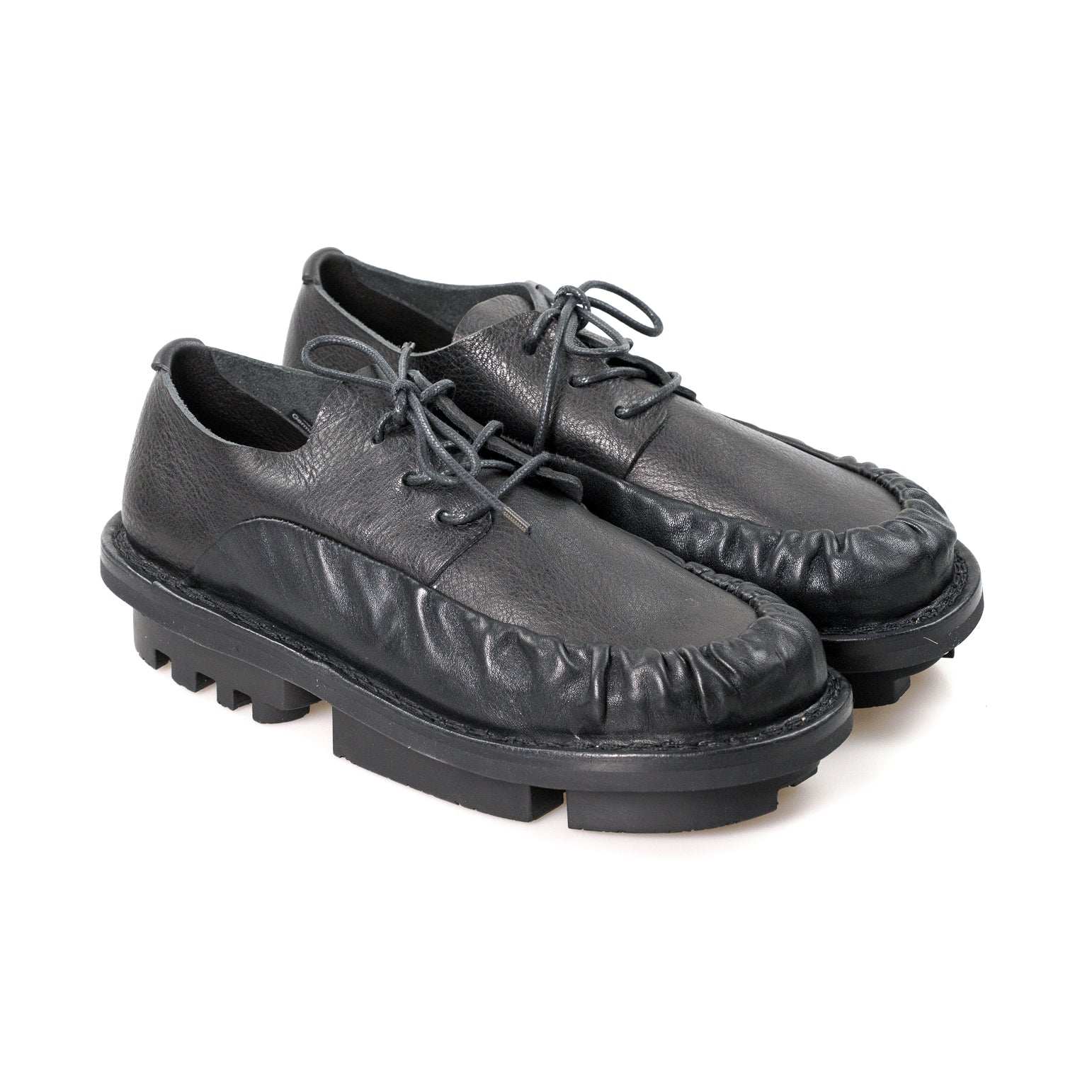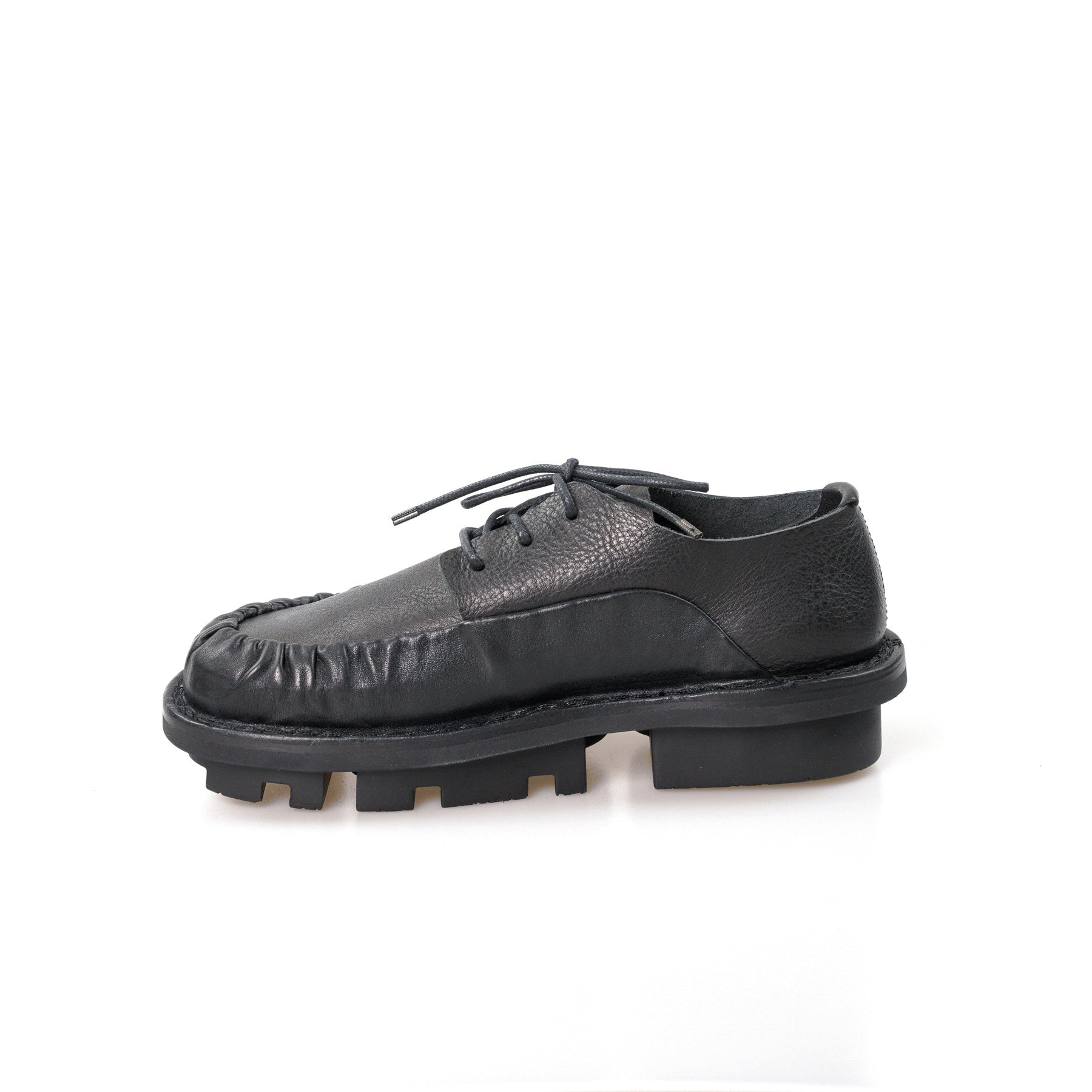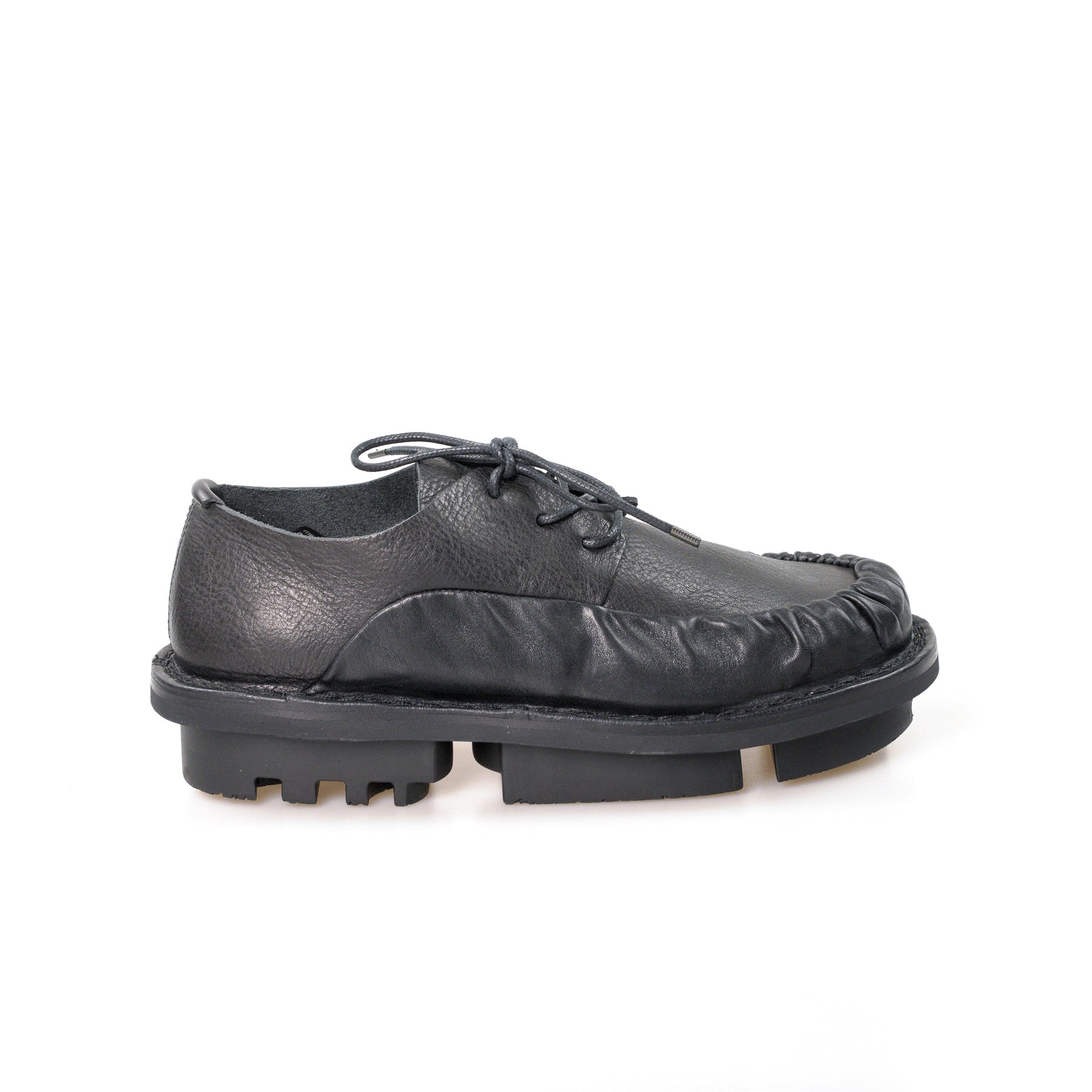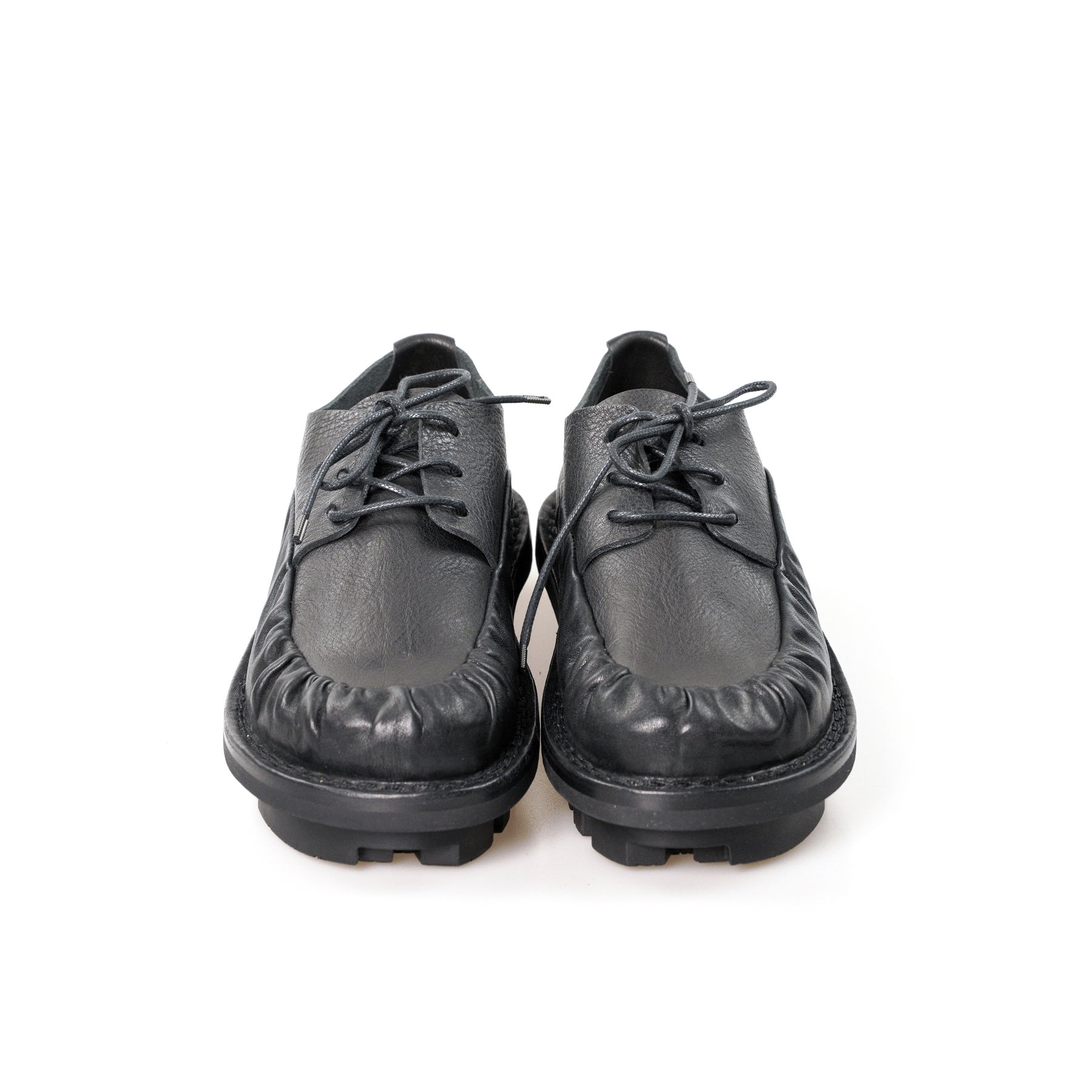Sieve is a lace up shoe that combines classic structure with expressive surface detail. Finely formed pleats are bordered along the edge of the vamp and flow seamlessly beneath the derby-style lacing, creating a sense of movement and subtle volume across the upper. The clean quarters and open throat maintain a balanced, refined silhouette.