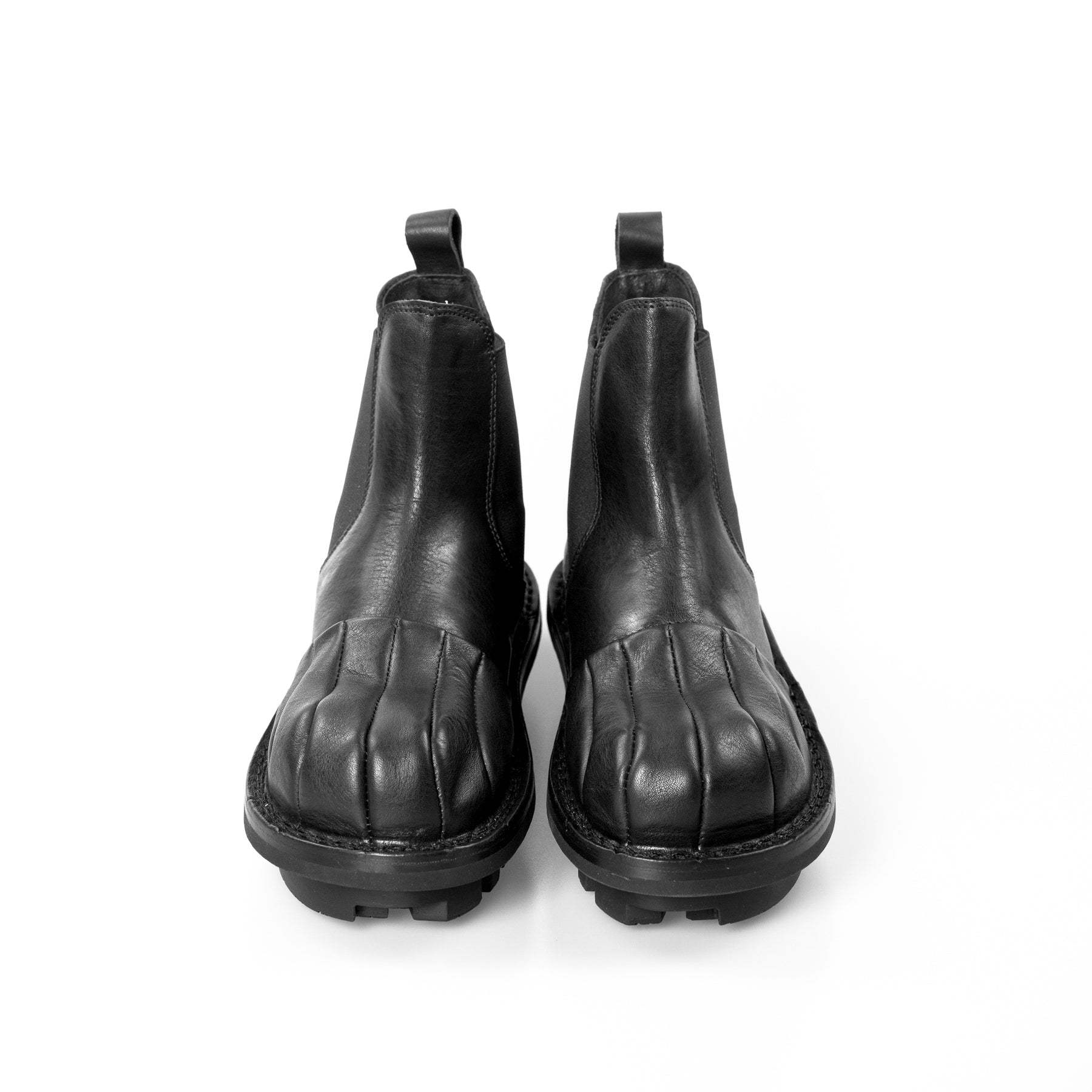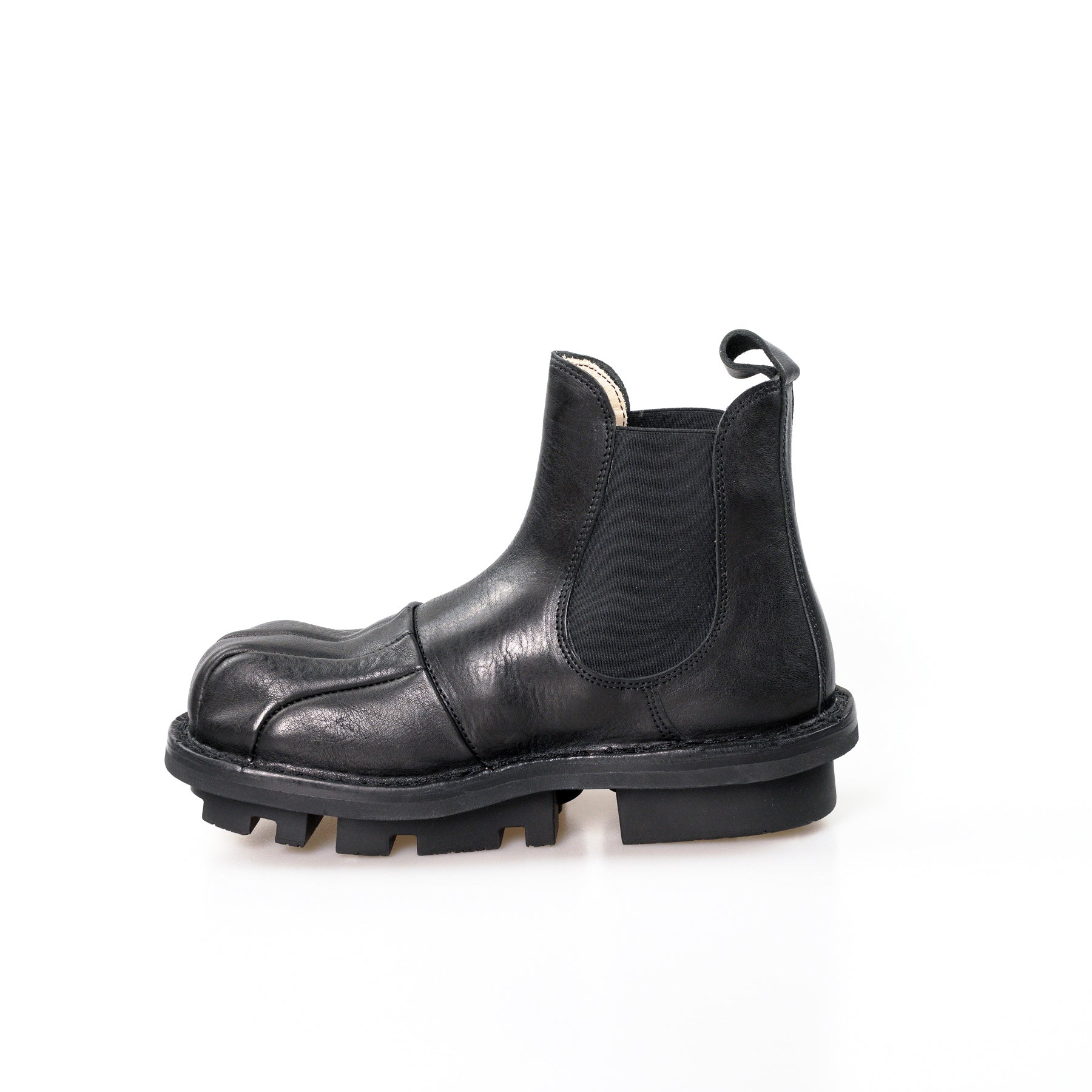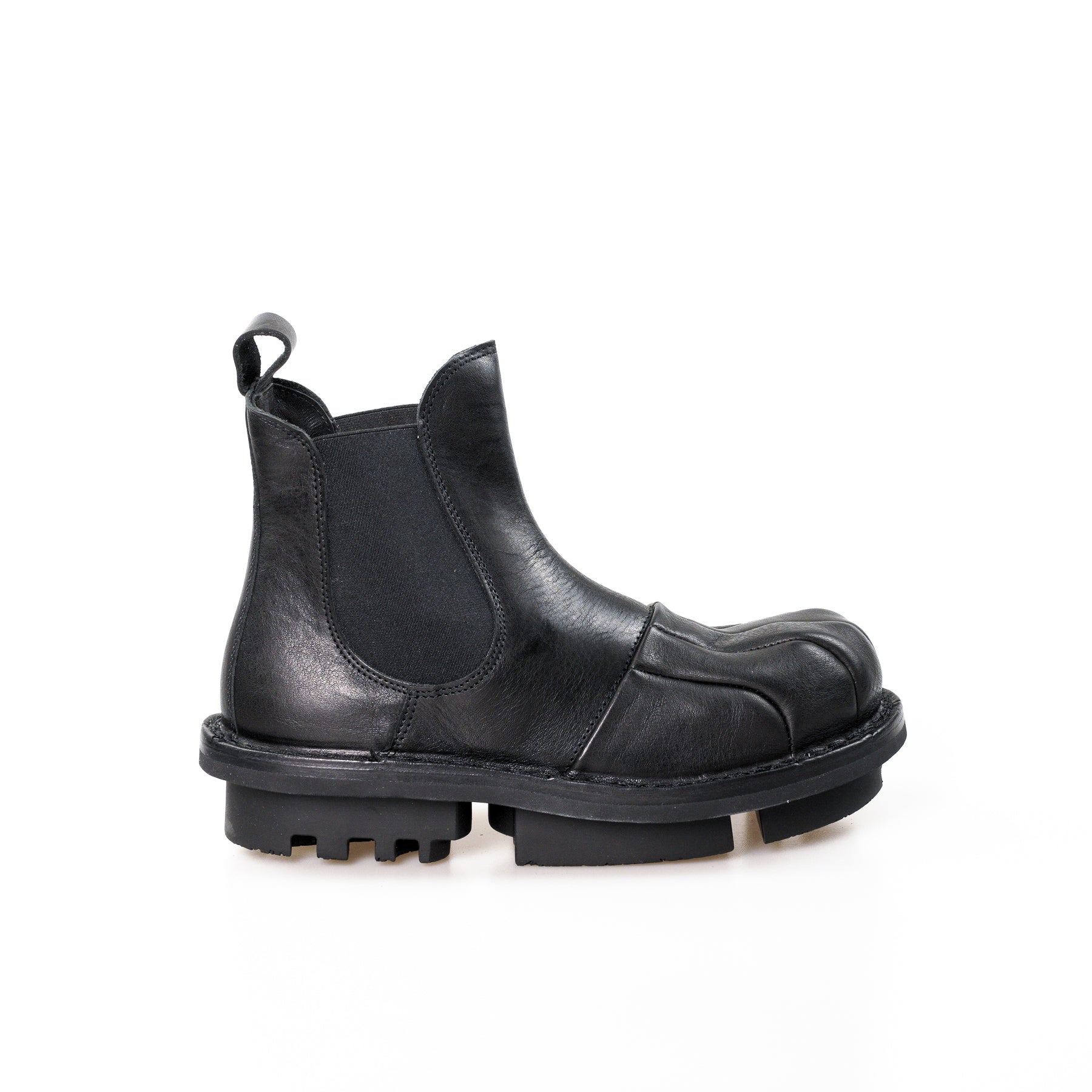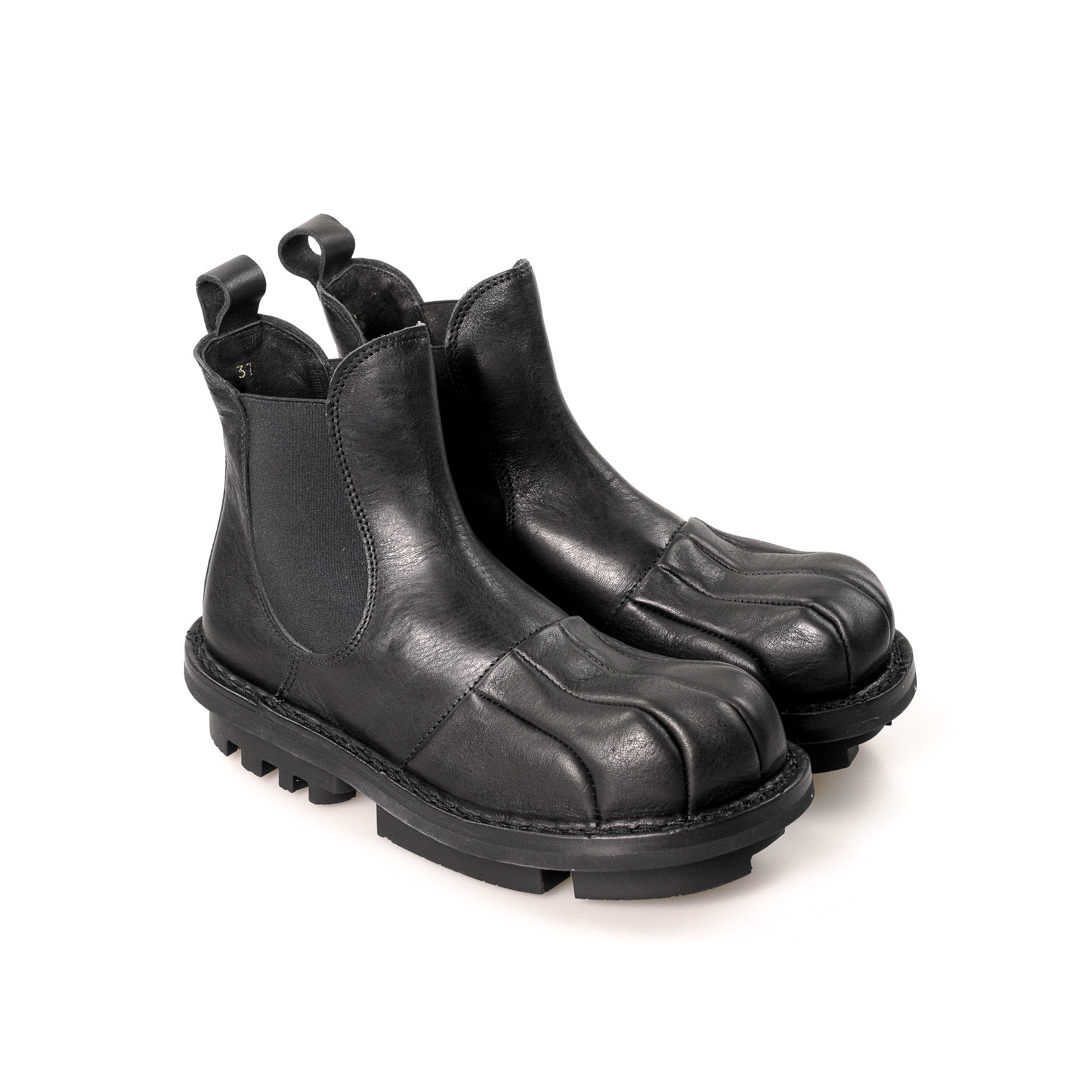 Surge is a Chelsea boot reimagined with bold proportions and a distinctive toe design. The finely crafted, flowing overdrawing of the cap section creates a sculptural silhouette that sets it apart from traditional styles. Smooth leather panels and elastic side inserts offer both structure and ease, while the pull tab at the heel allows for effortless wear.