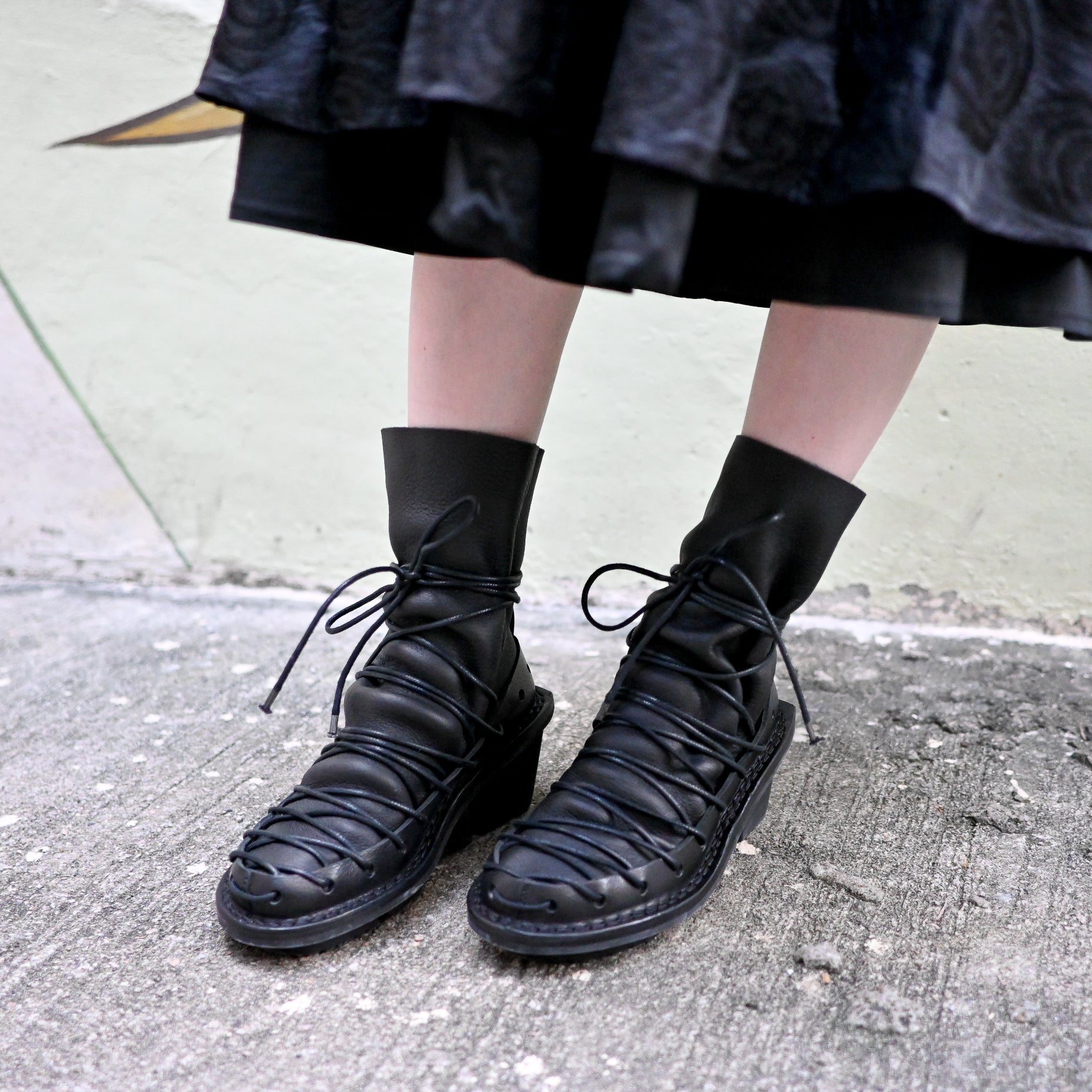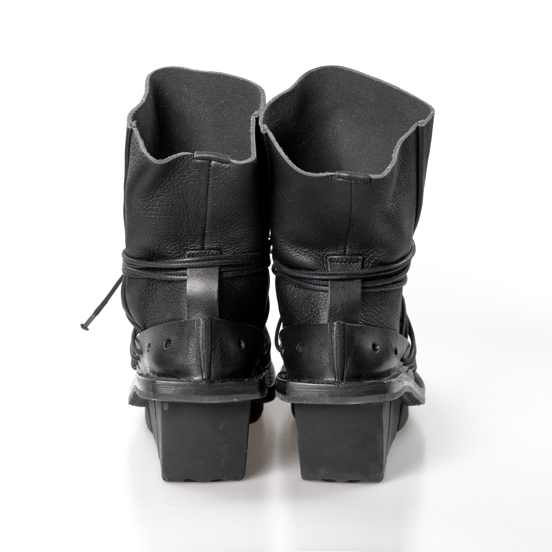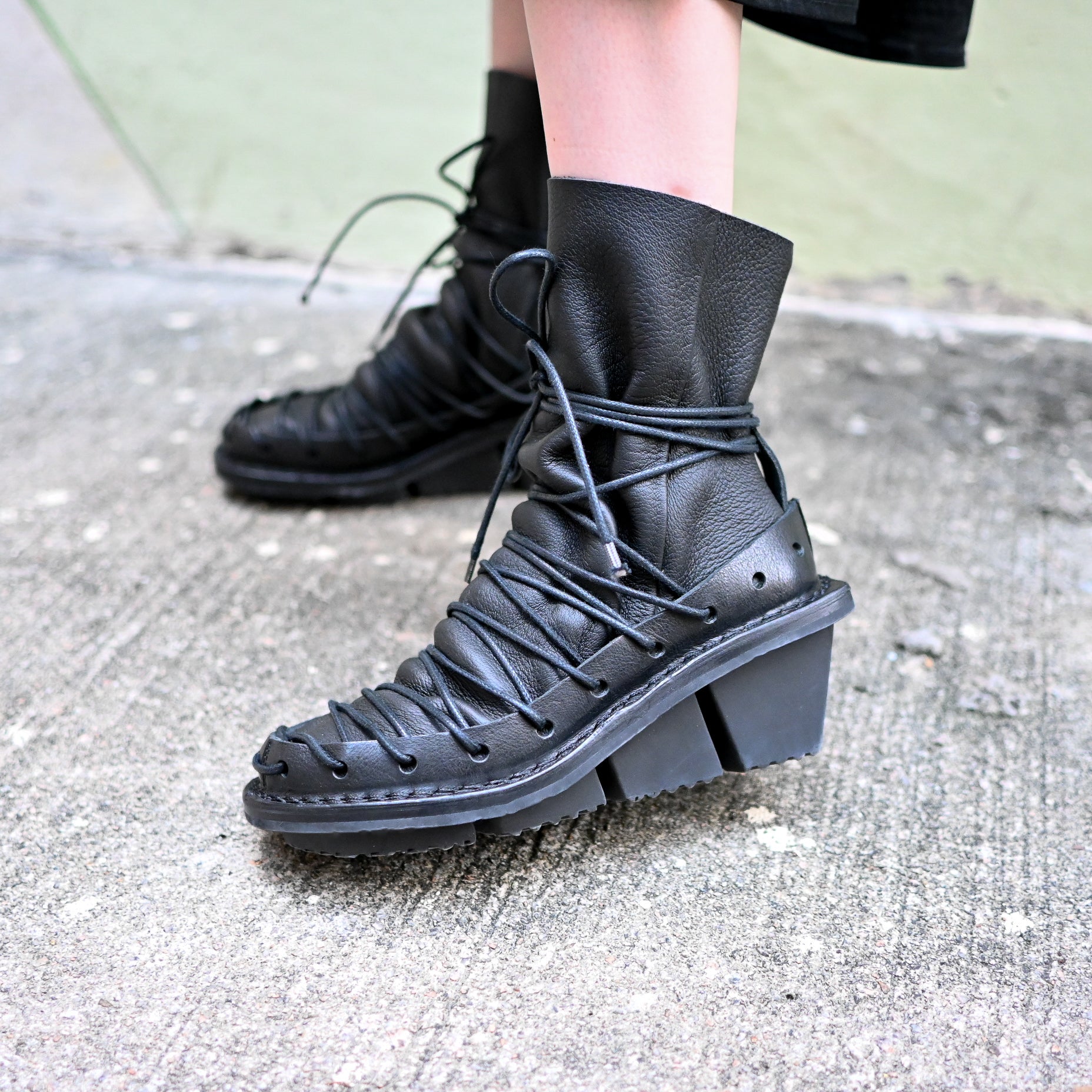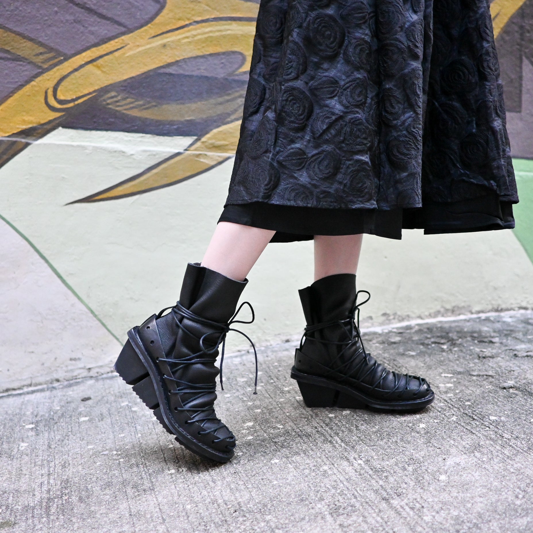 Tidebound is a high-cut lace up boot featuring an all-around leather lacing system that threads through sculpted cut outs along the upper and base. The soft shaft can be worn scrunched or extended, giving the silhouette a dynamic and expressive shape. The layered leather and continuous lacing offer a secure fit while adding texture and rhythm to the overall form.