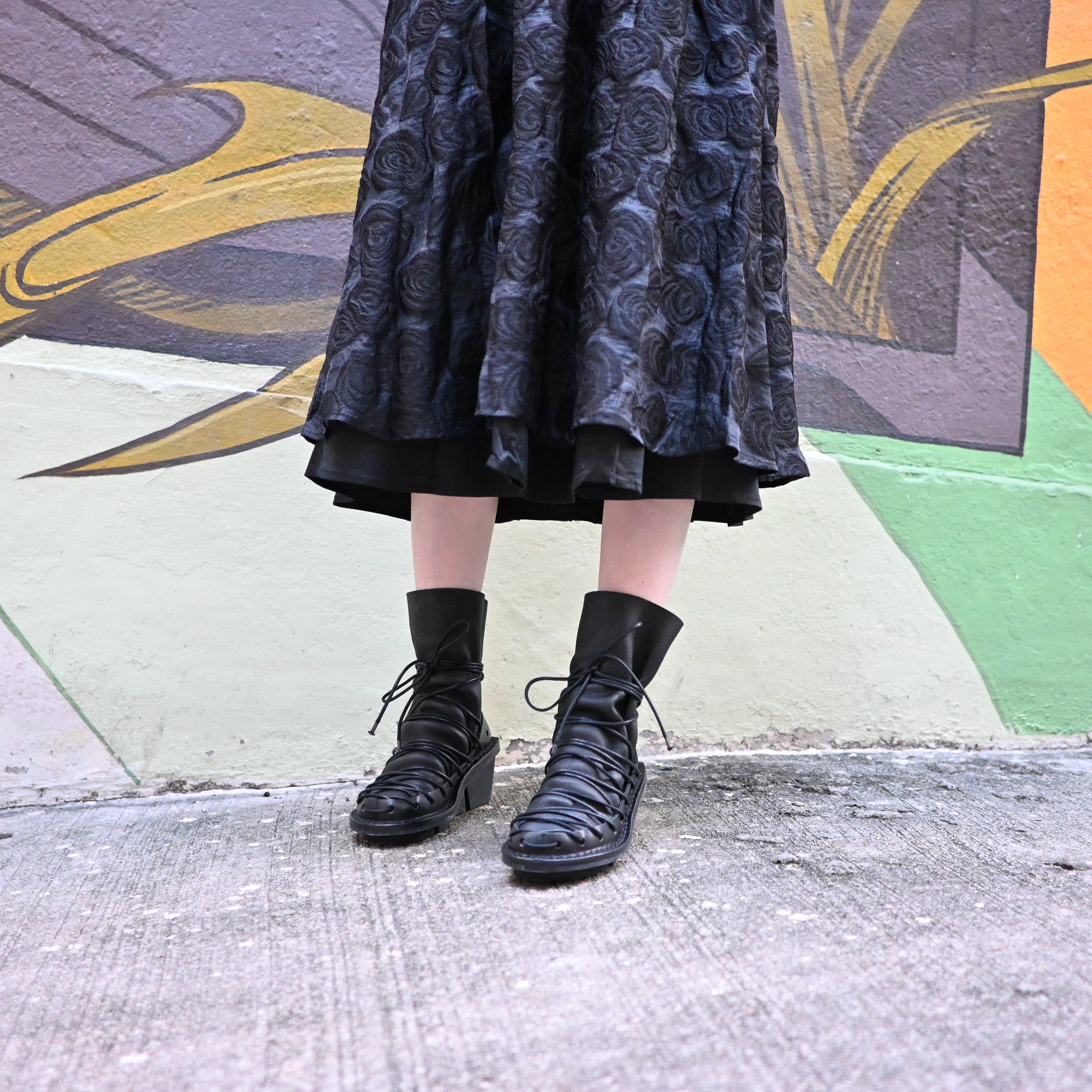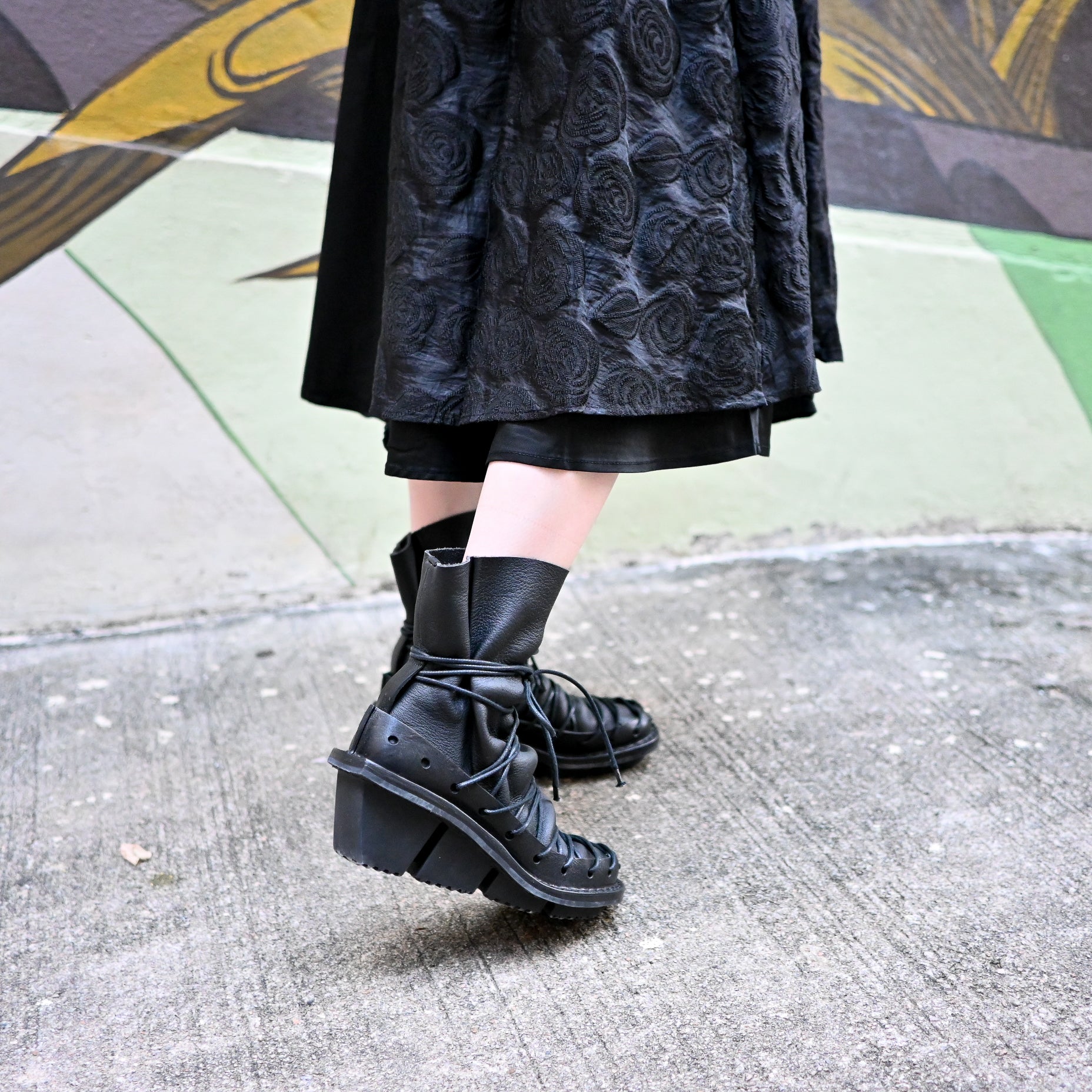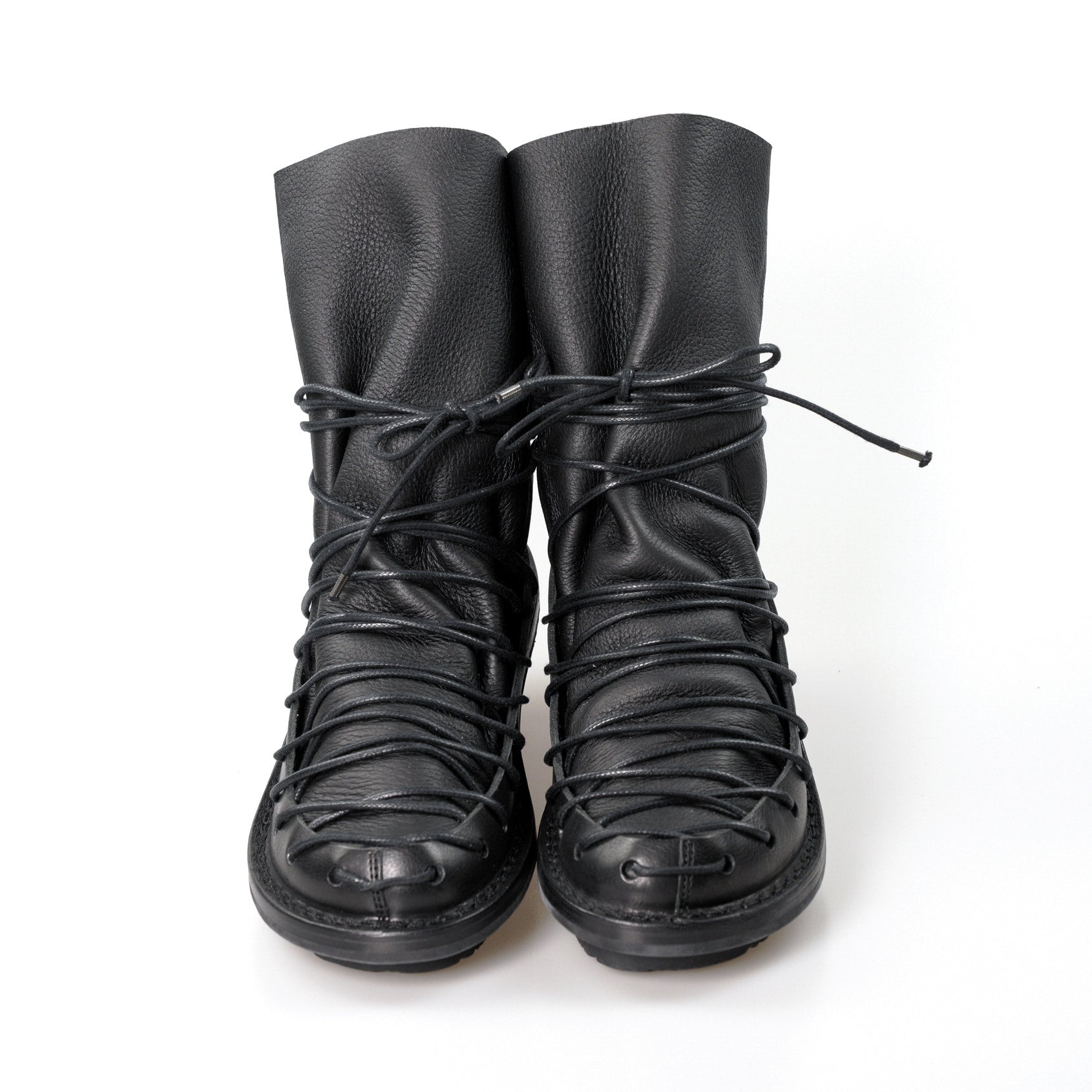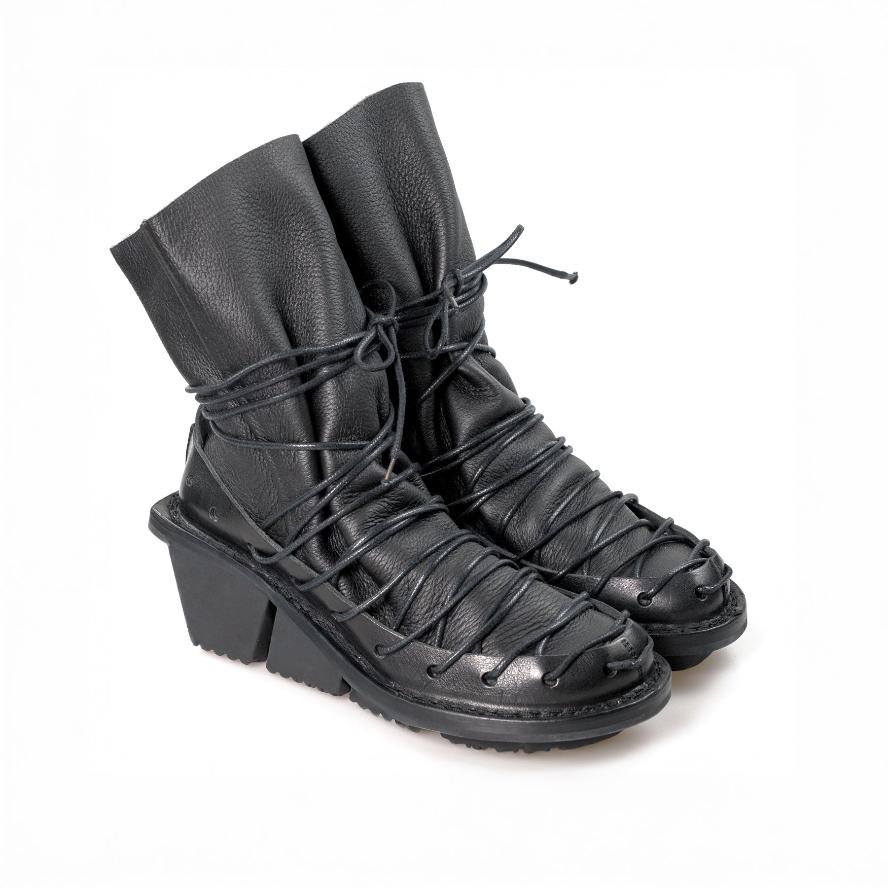 Tidebound is a high-cut lace up boot featuring an all-around leather lacing system that threads through sculpted cut outs along the upper and base. The soft shaft can be worn scrunched or extended, giving the silhouette a dynamic and expressive shape. The layered leather and continuous lacing offer a secure fit while adding texture and rhythm to the overall form.