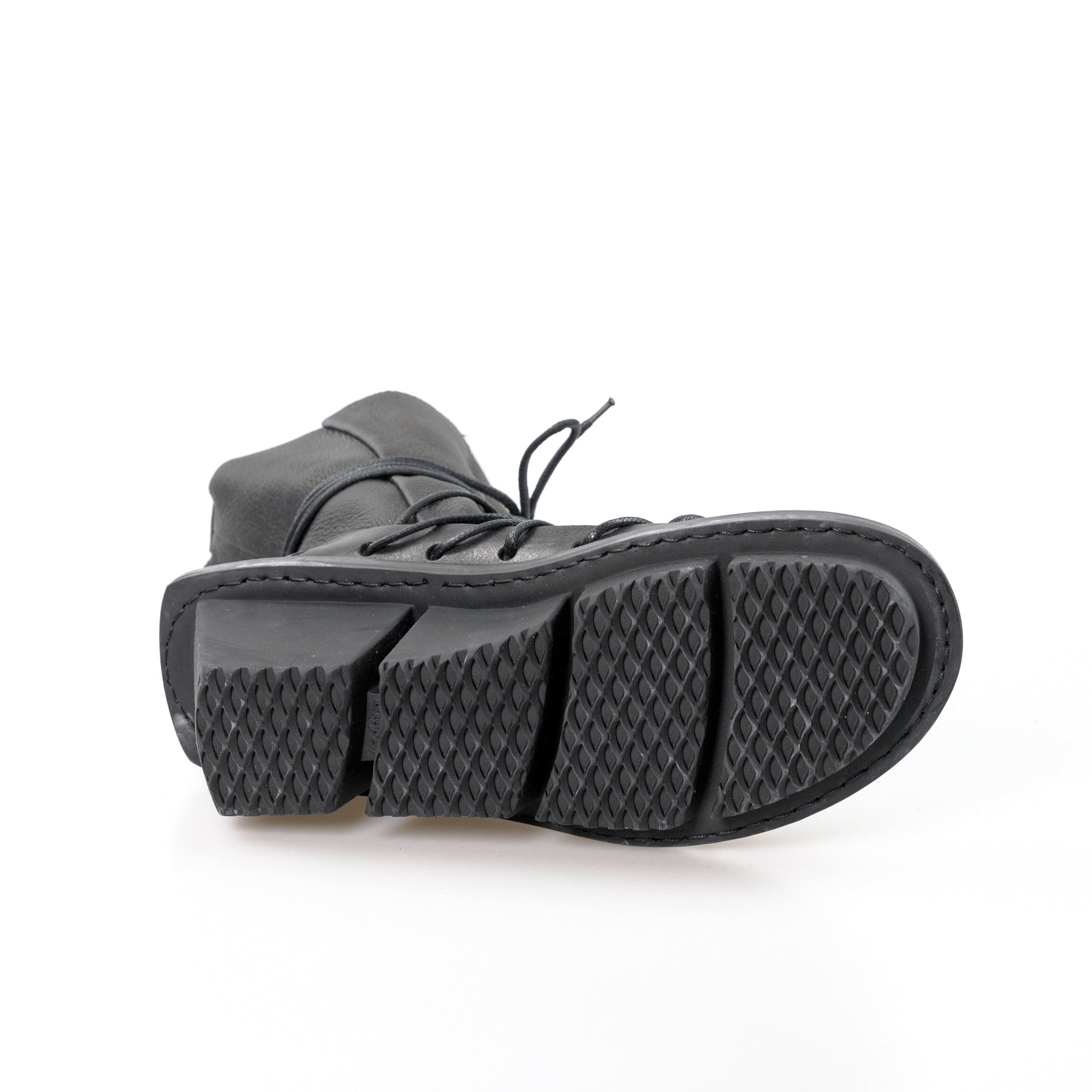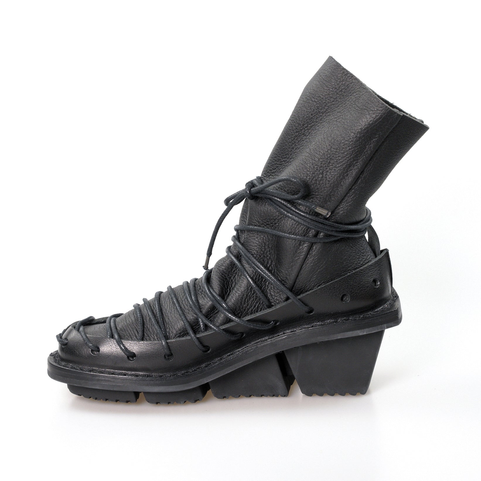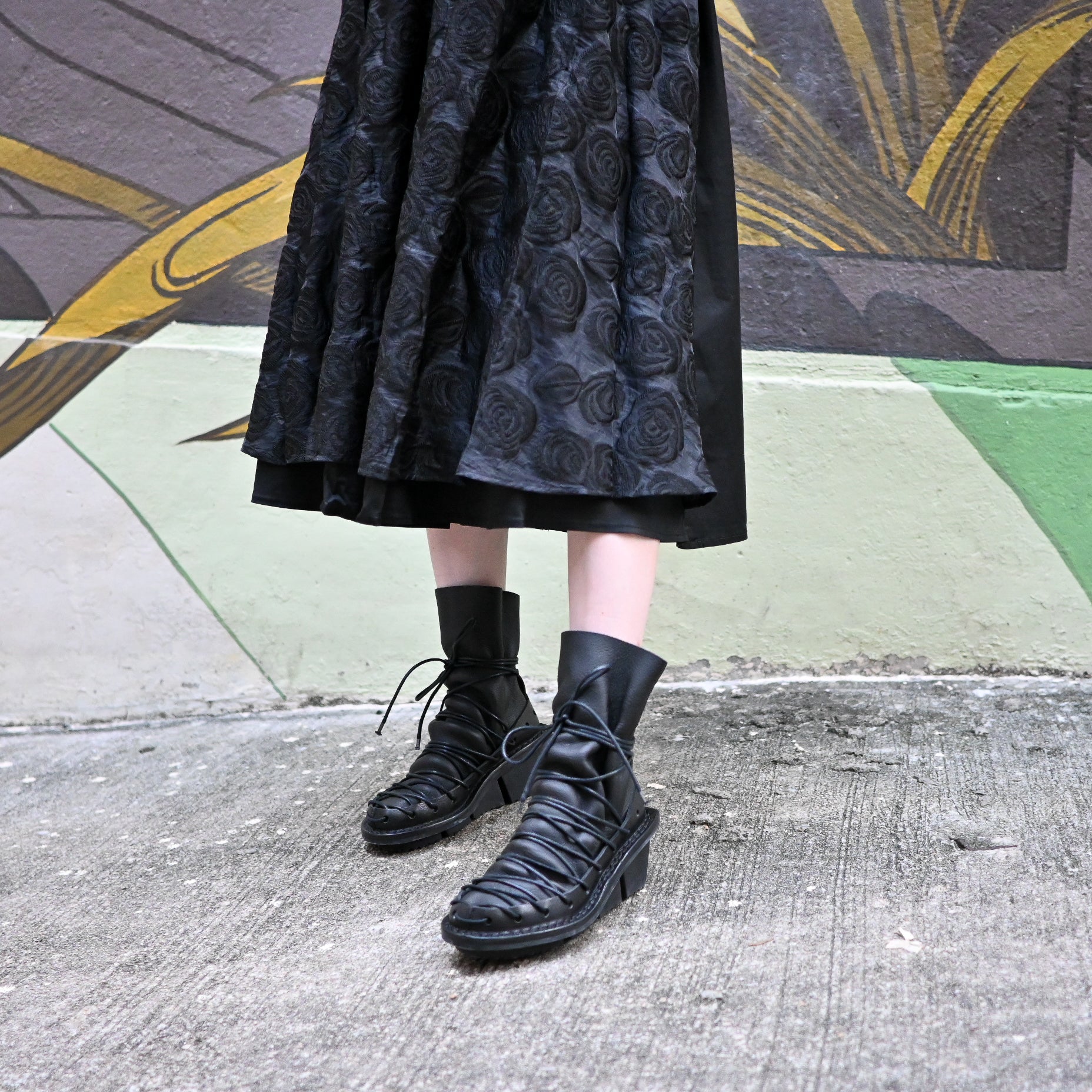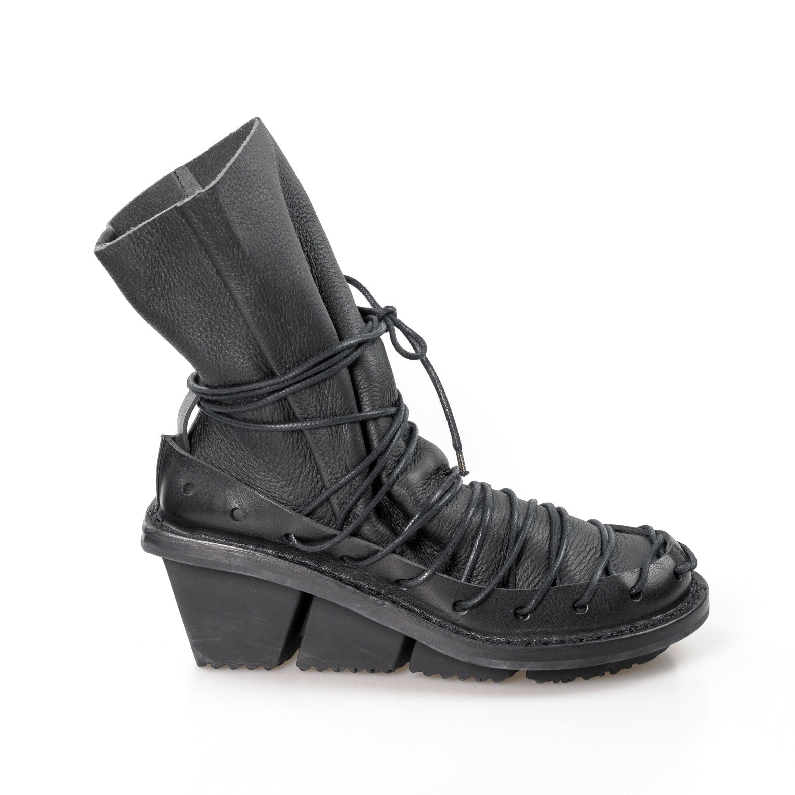 Tidebound is a high-cut lace up boot featuring an all-around leather lacing system that threads through sculpted cut outs along the upper and base. The soft shaft can be worn scrunched or extended, giving the silhouette a dynamic and expressive shape. The layered leather and continuous lacing offer a secure fit while adding texture and rhythm to the overall form.