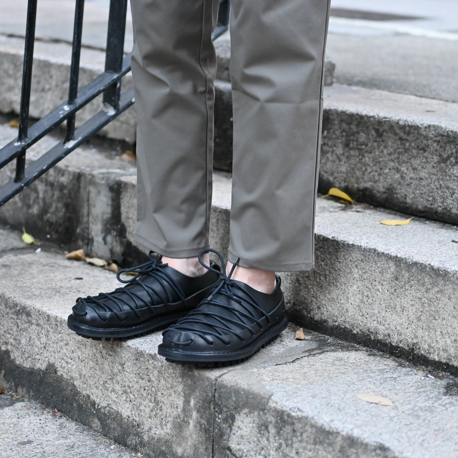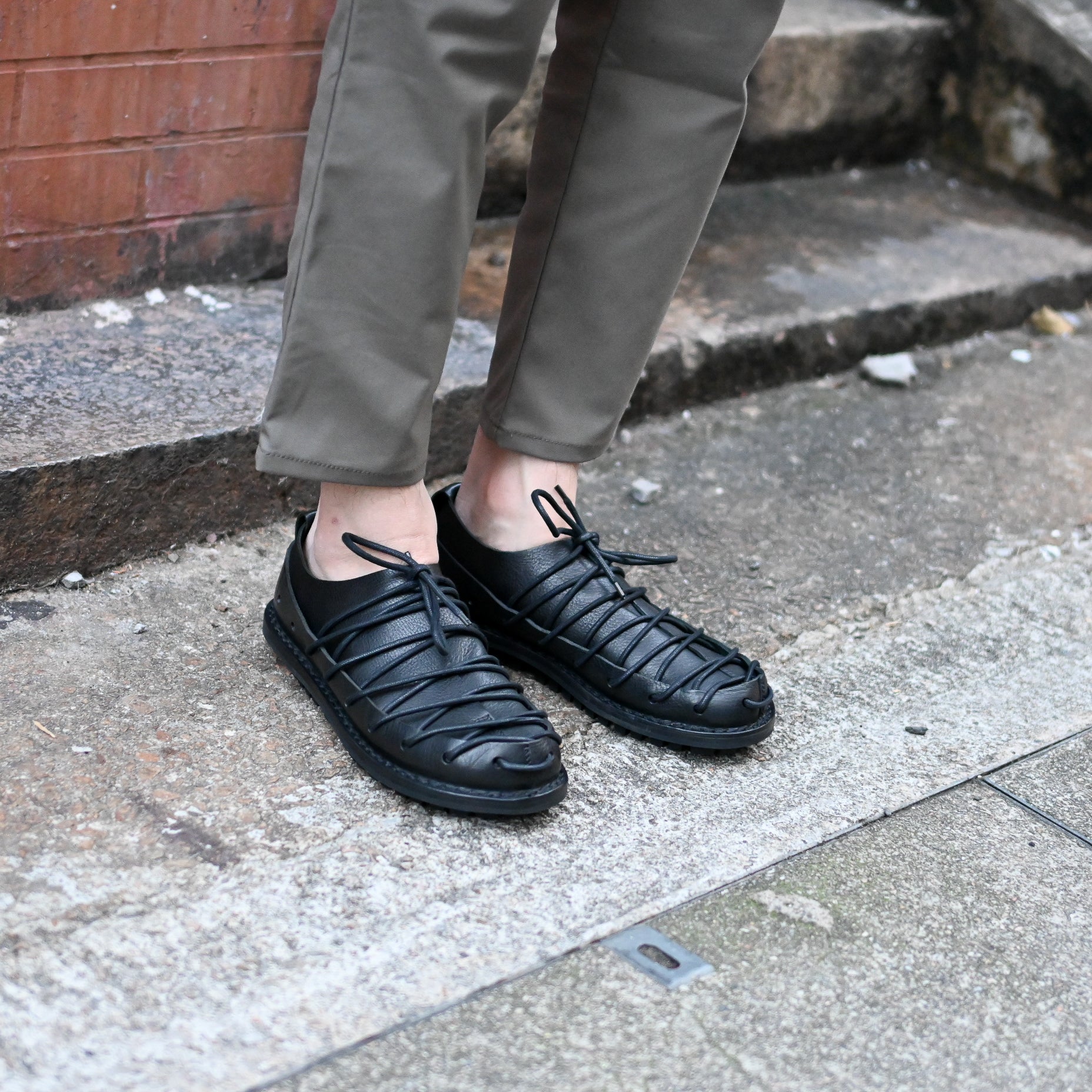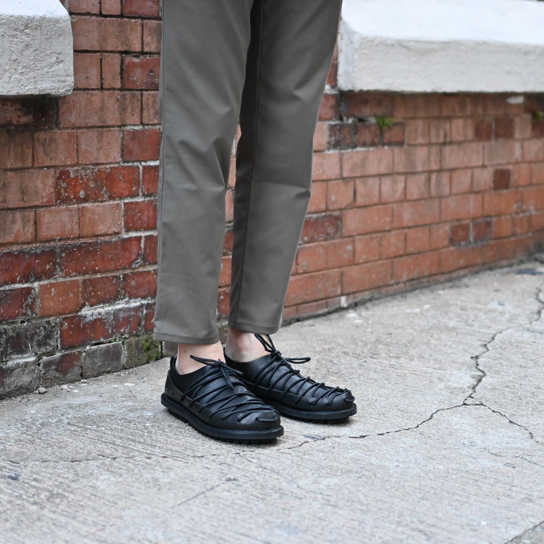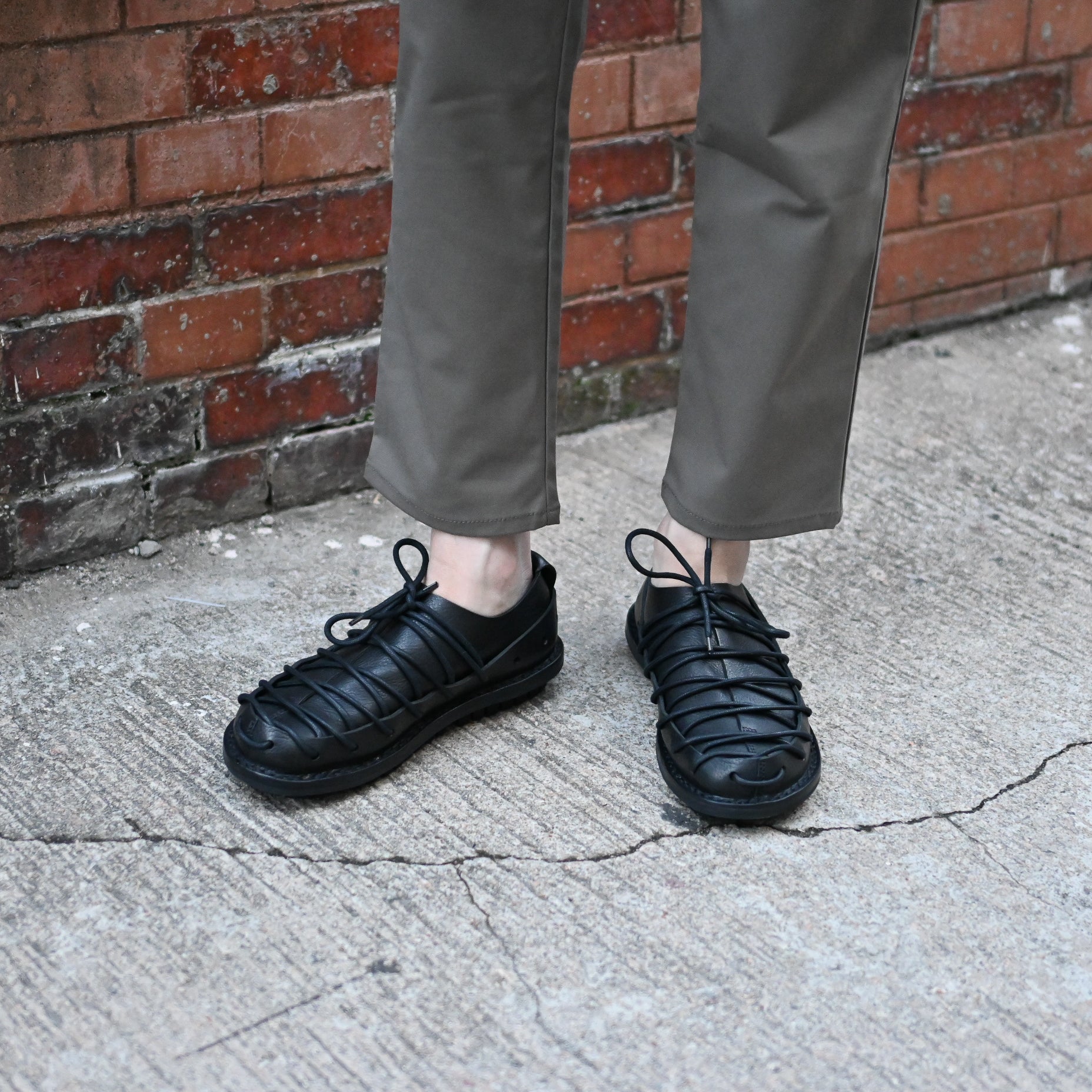 Tidehold is a bold lace up shoe designed with continuous leather lacing that loops through a series of cut outs along the upper and outsole. The intricate structure creates a striking visual rhythm while allowing for adjustable fit and breathability. Crafted from soft vegetable tanned leather, the upper wraps securely around the foot with an open weave feel.