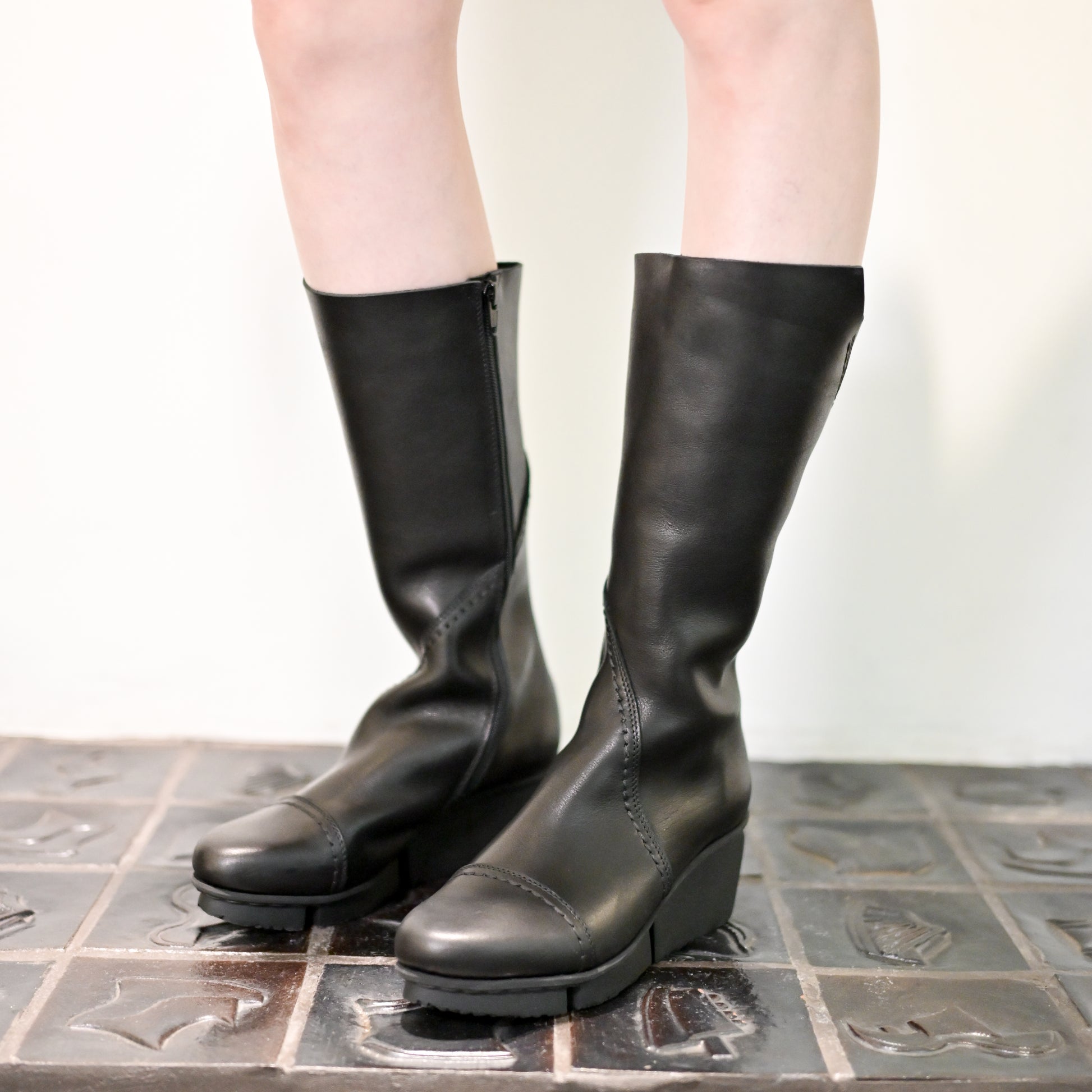 Tour 是一款精致的中筒靴,拥有优美的修长轮廓。靴身采用光滑的黑色皮革精制而成,线条流畅,完美贴合腿部曲线。靴筒顶部的不对称褶皱设计,增添了一丝雕塑感,赋予靴子优雅的建筑美感,同时又不失其简约永恒的魅力。锥形靴筒和圆润的鞋头勾勒出优雅柔美的线条,无论是日常穿着还是正式场合,都能轻松驾驭。