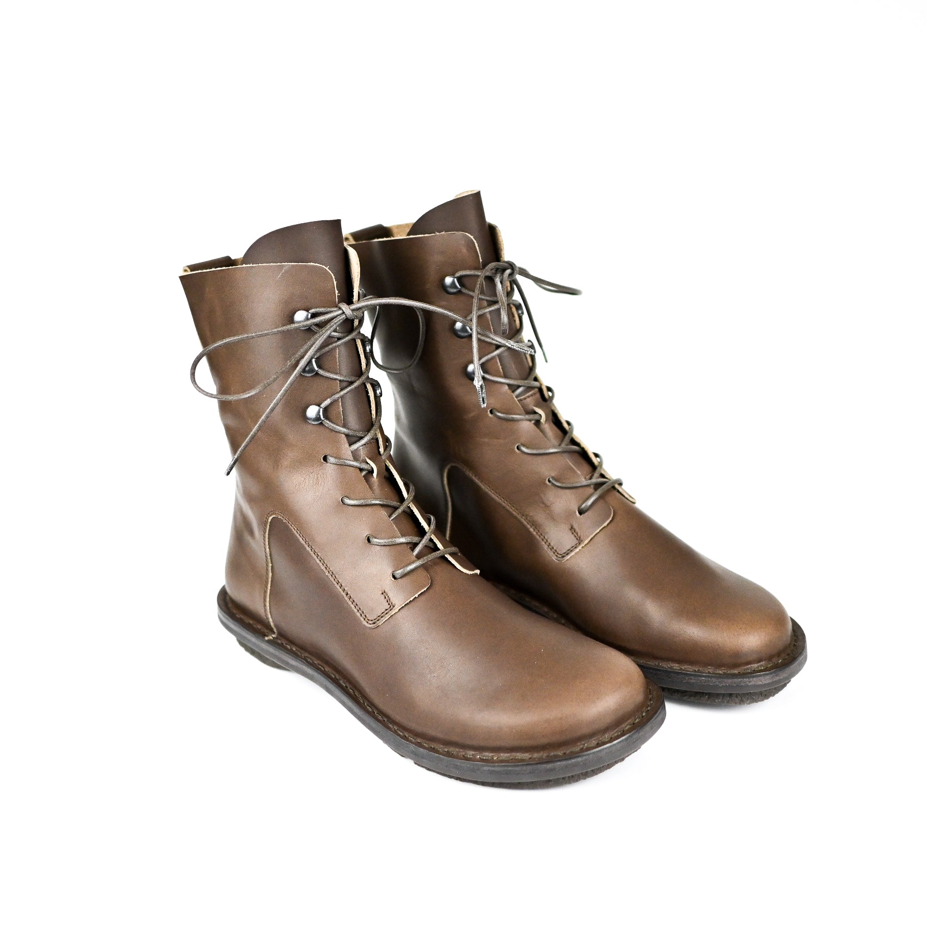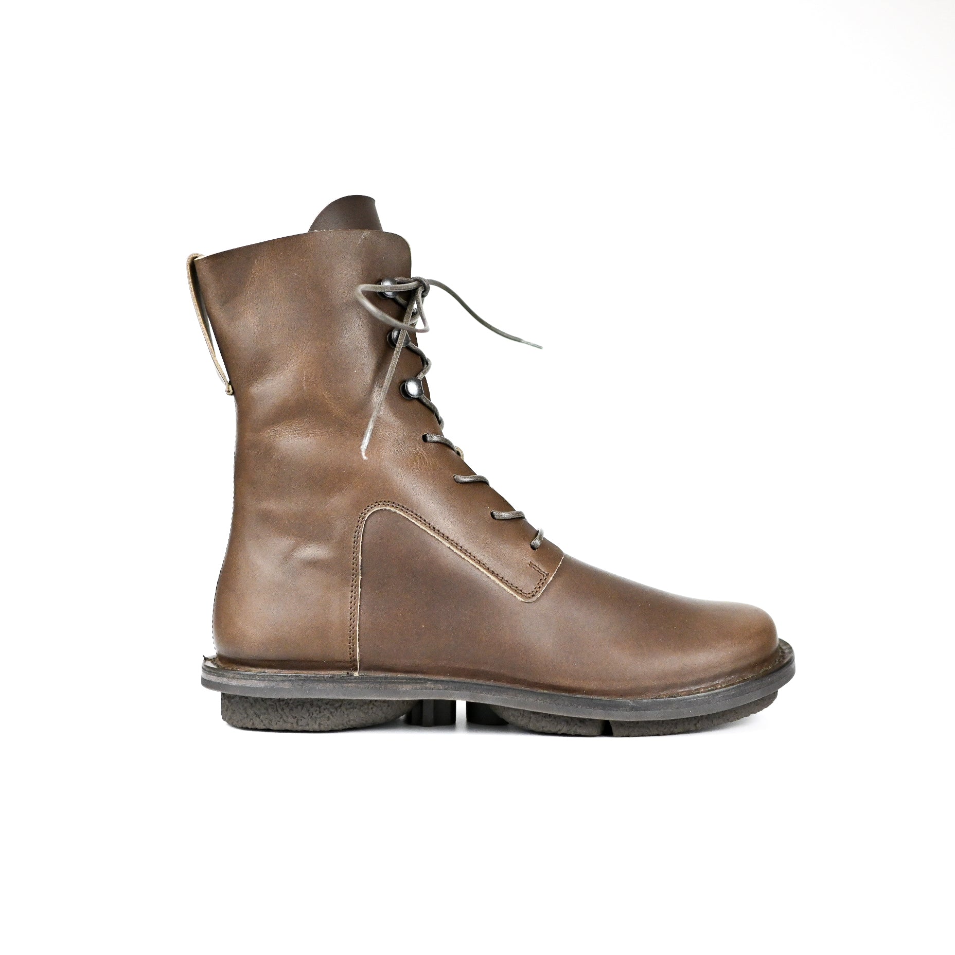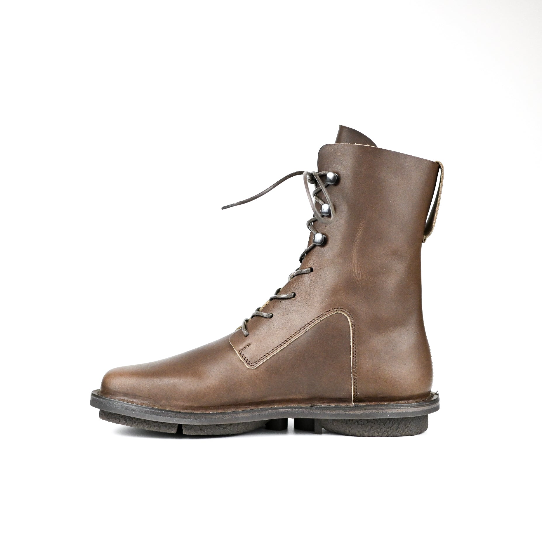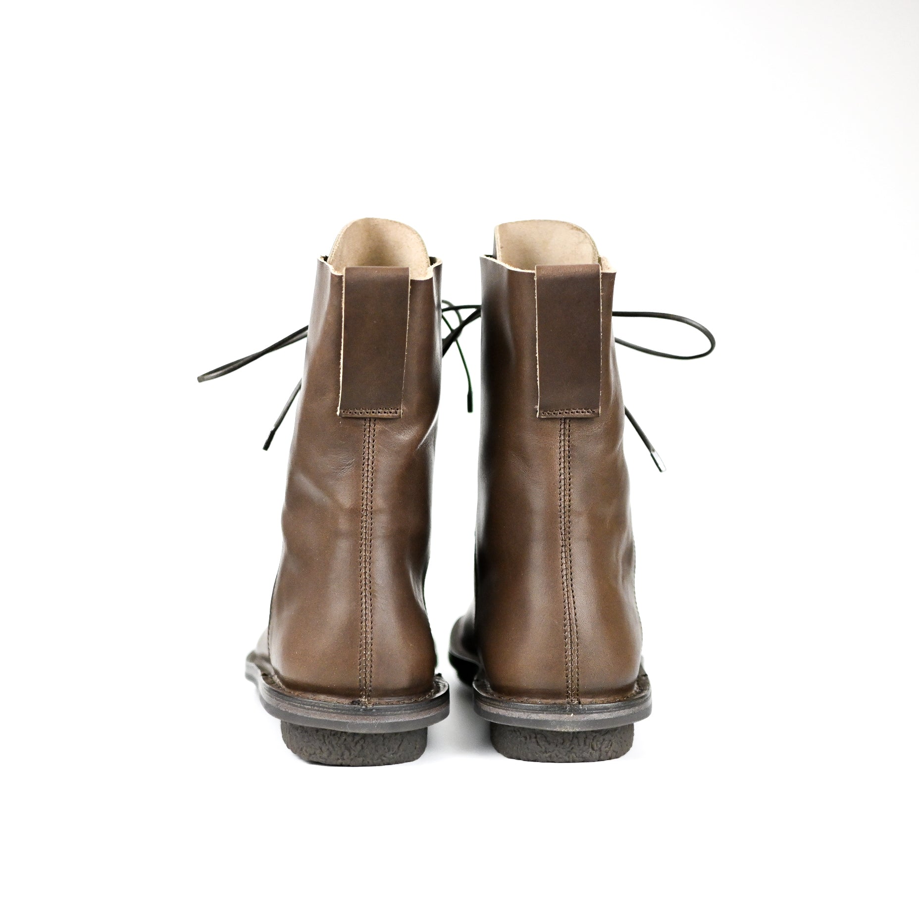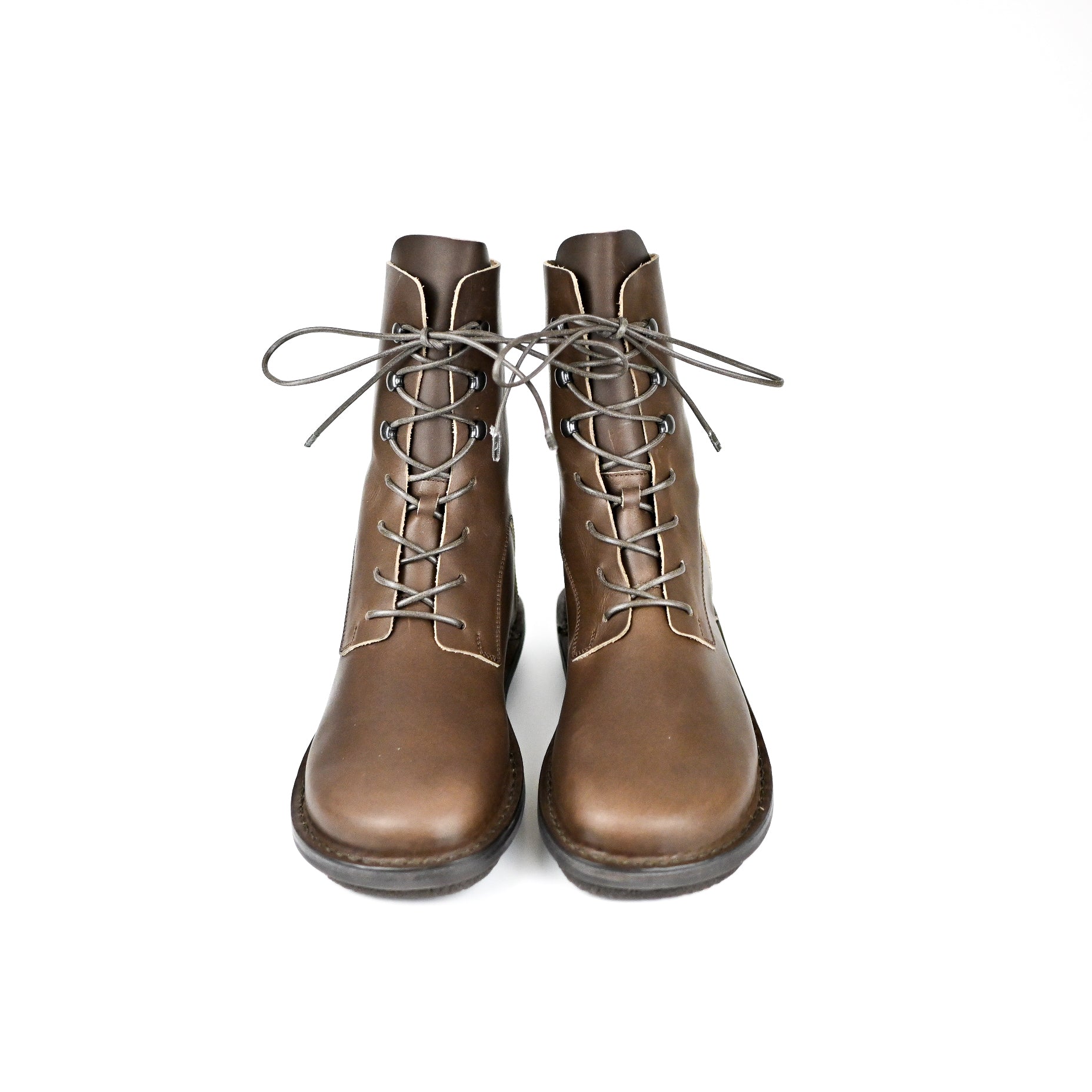 Bert 是中幫繫帶靴,輪廓簡潔,細節低調。柔軟的靴筒高至腳踝以上,並結合傳統鞋眼和金屬快鉤,既能提供支撐,又能輕鬆調節。簡潔的側片和圓頭設計,使其外觀雋永百搭。